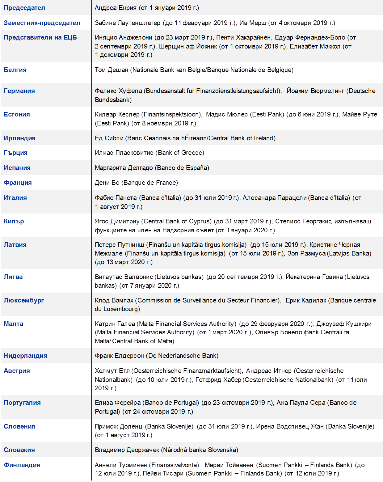 - Административният съвет за преглед има петима членове: Жан-Пол Редуен (председател), Кончета Бреша Мора (заместник-председател), Хавиер Аристеги, Андре Камилери, Едгар Майстер (до 7 септември 2019 г.), Герд Хойзлер (считано от 18 декември 2019 г.), както и двама заместници: Рене Смитс и Иван Шрамко. През септември 2019 г. Управителният съвет поднови мандатите на Жан-Пол Редуен, Кончета Бреша Мора, Хавиер Аристеги, Андре Камилери и Рене Смитс. Административният съвет за преглед е създаден по силата на Решение ЕЦБ/2014/16 относно създаването на Административен съвет за преглед и установяването на оперативните му правила. То беше изменено с Решение (ЕС) 2019/1378 на Европейската централна банка от 9 август 2019 г. (ЕЦБ/2019/27) с цел да се прецизира ролята на заместниците и методологията за разпределението на разноските, направени от заявителите и от ЕЦБ.