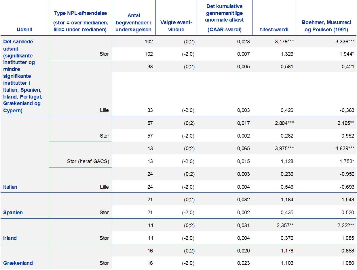 - Event study-metoden er baseret på modellen offentliggjort af Fama et al. i 1969 (se Fama E.F., Fisher L., Jensen M.C. og Roll R. "The Adjustment of Stock Prices to New Information", International Economic Review, bd. 10, nr. 1, 1969, s. 1-21). For det første blev "begivenhederne" identificeret. For det andet blev de unormale afkast beregnet ved at trække det forventede normale afkast, såfremt der ikke havde været nogen meddelelse om NPL-afhændelse, fra det faktiske afkast af bankernes beholdninger. For det tredje blev det kumulative unormale afkast (cumulative abnormal return, CAR) beregnet ved at addere de individuelle unormale afkast med henblik på at måle den samlede virkning af en afhændelse over en bestemt periode kaldet "event-vinduet". Endelig blev de kumulative gennemsnitlige unormale afkast (cumulative average abnormal returns, CAAR) beregnet. De repræsenterer middelværdien af alle begivenhederne i ovenstående udsnit af lande, dvs. de gennemsnitlige aktiemarkedsreaktioner (i procent) på pressemeddelelserne. For at kontrollere CAARs statistiske signifikans blev der anvendt to statistiske parametriske test: i) den parametriske tværsnits-t-test og ii) testen indført af Boehmer, Musumeci og Poulsen i 1991, idet sidstnævnte er robust over for den varians, som følger af begivenheden (se Boehmer, E. Musumeci, J og Poulsen, A.B., "Event-study methodology under conditions of event-induced variance", Journal of Financial Economics , bd. 30, nr. 2, 1991, s. 253-272).