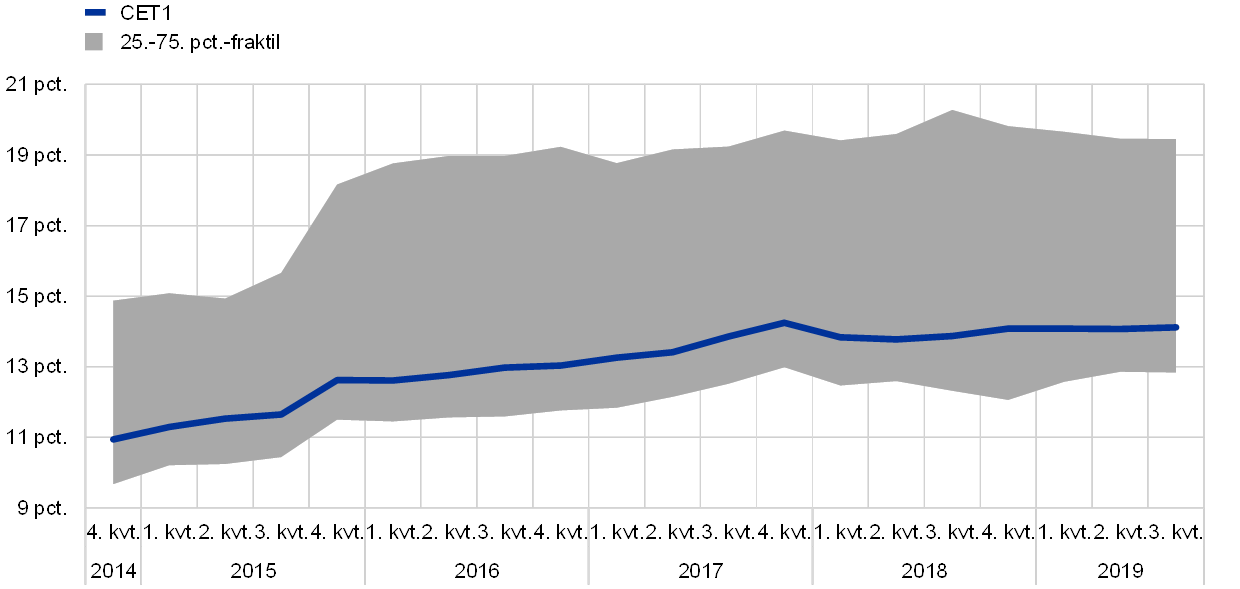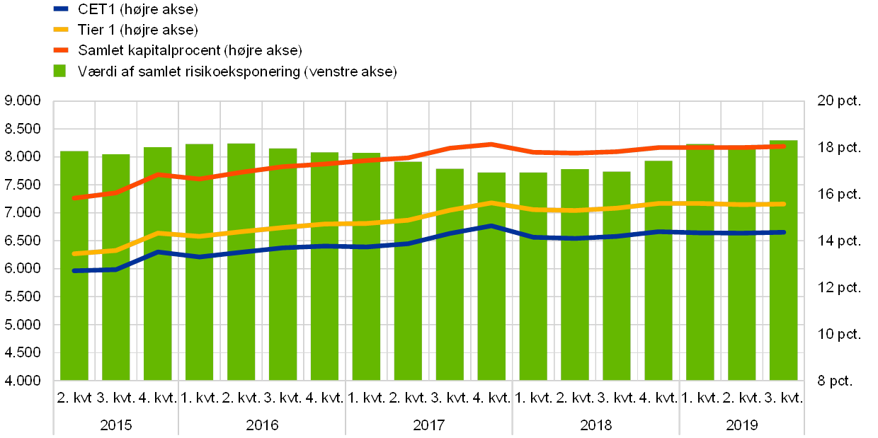 De signifikante institutters vægtede gennemsnitlige "fully-loaded" CET1 lå stabilt på 14,1 pct. i perioden fra 4. kvartal 2018 til 3. kvartal 2019 (se figur 2). Gearingsgraden steg en smule i løbet af de første tre kvartaler af 2019 og var på 5,42 pct. i 3. kvartal mod 5,32 pct. et år tidligere (se figur 3).