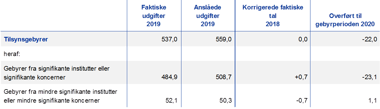 - Fra og med gebyrperioden 2020 vil ECB's tilsynsgebyrer blive beregnet på baggrund af de faktiske årlige omkostninger, dvs. efter gebyrperioden. Se nærmere om ændringerne af gebyrrammen i afsnit 6.2.