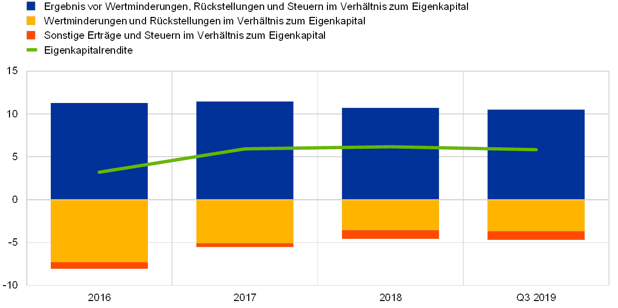 Nach einem mehrjährigen Abwärtstrend und Tiefstand im Jahr 2018 stiegen die Wertminderungen und Rückstellungen in den ersten drei Quartalen 2019 im Vergleich zum Vorjahreszeitraum wieder stark an. Hierdurch wurde der Ertragsdruck weiter verstärkt. Diese Zunahme war überall zu beobachten – auch in Ländern mit geringen Beständen an notleidenden Krediten. Gründe hierfür sind in erster Linie die Rückstellungen für Kreditausfälle bei NPL-Neubeständen sowie Wertminderungen auf nichtfinanzielle Vermögenswerte der Banken im Zusammenhang mit deren Umstrukturierungsprogrammen.