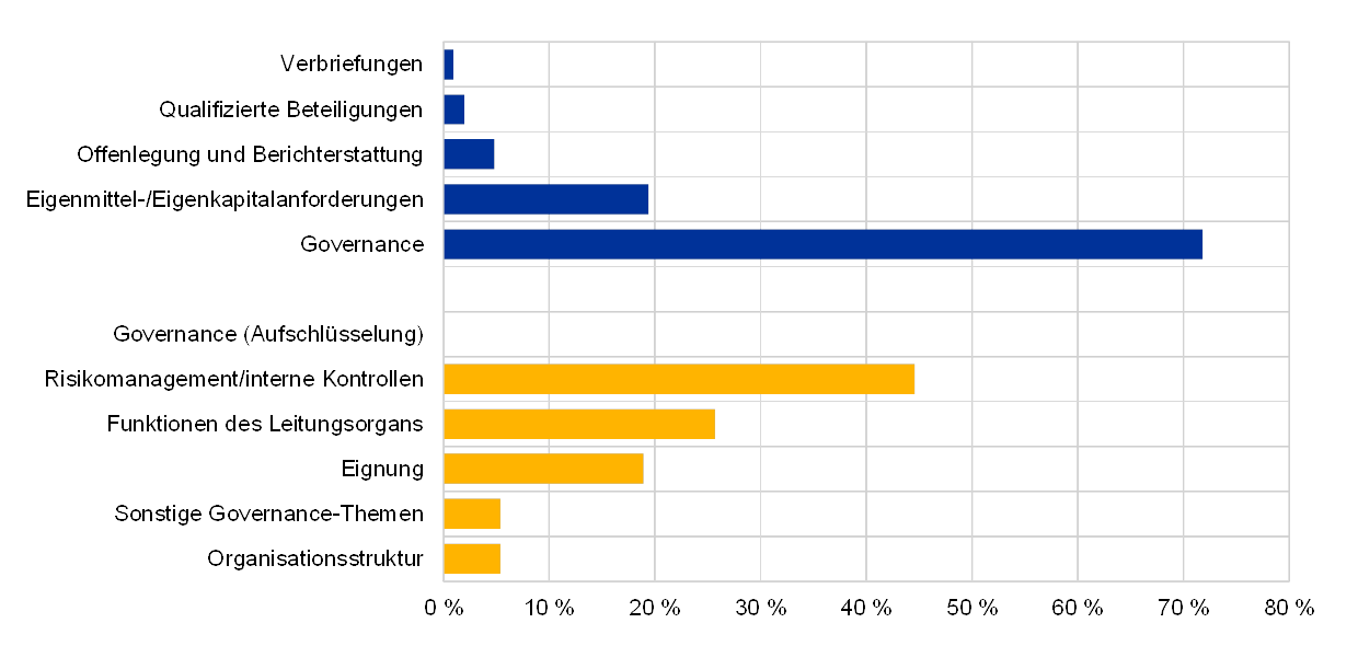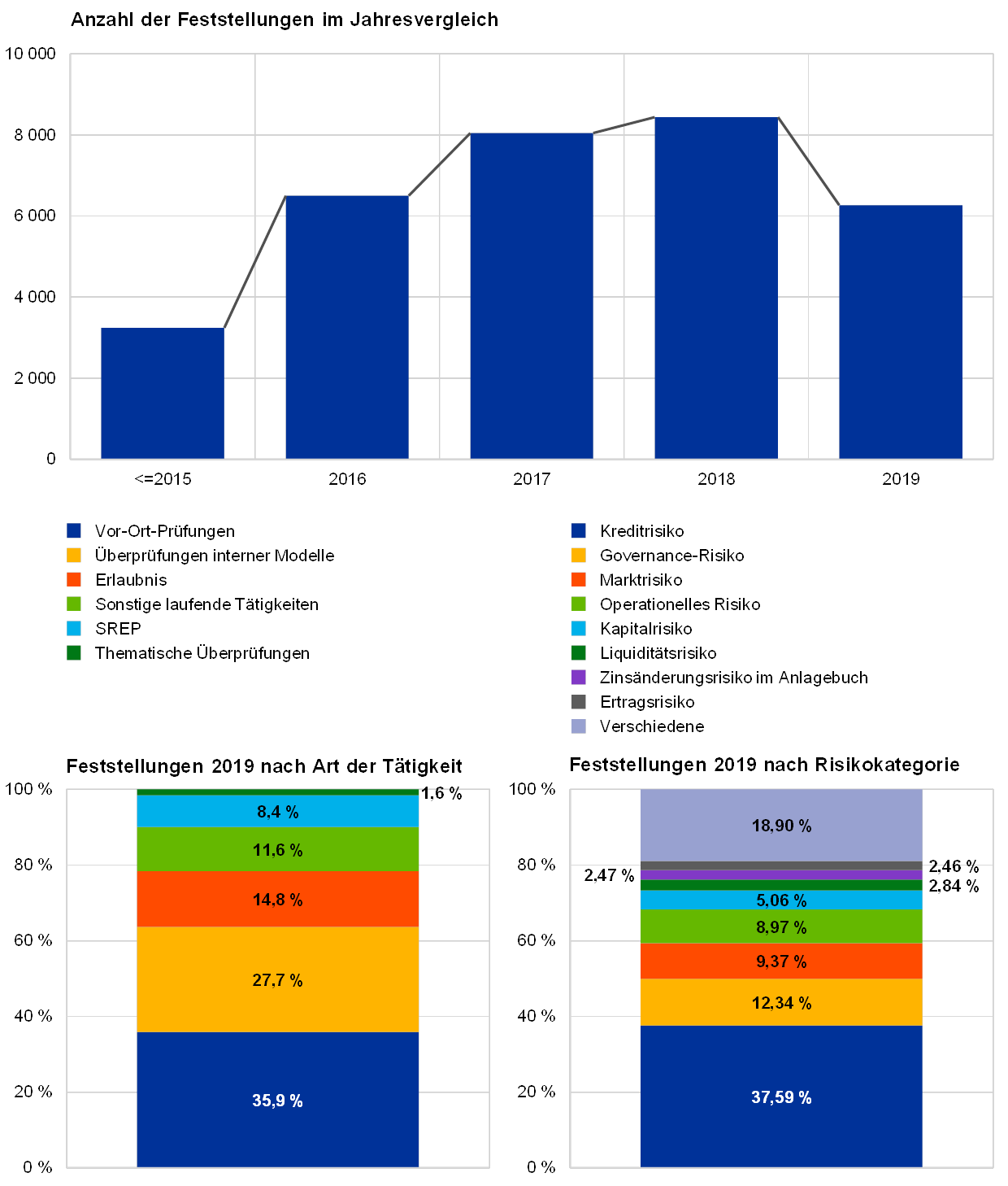 - Für diesen Rückgang gab es vor allem zwei Gründe: a) 2019 wurden keine thematischen Überprüfungen abgeschlossen, sodass eine Quelle für Feststellungen entfiel; b) Feststellungen aus Überprüfungen interner Modelle werden nun in einem späteren Verfahrensstadium aufgenommen, was im Berichtsjahr zu einem einmaligen Absinken der Anzahl der Feststellungen führte.