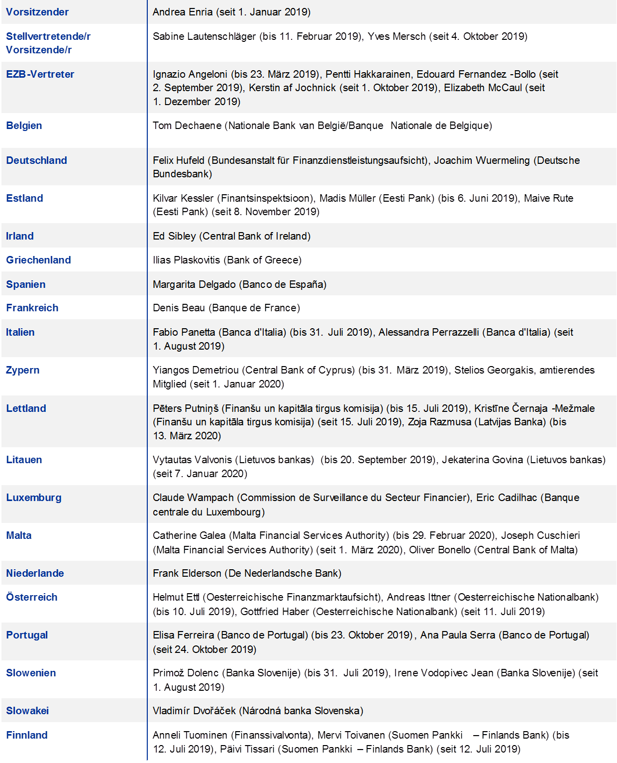 - Der administrative Überprüfungsausschuss setzt sich aus fünf Mitgliedern zusammen: Jean-Paul Redouin (Vorsitzender), Concetta Brescia Morra (Stellvertretende Vorsitzende), Javier Arístegui, André Camilleri, Edgar Meister (bis 7. September 2019), Gerd Häusler (seit 18. Dezember 2019). Hinzu kommen die beiden stellvertretenden Mitglieder René Smits und Ivan Šramko. Im September 2019 verlängerte der EZB-Rat die Amtszeiten von Jean-Paul Redouin, Concetta Brescia Morra, Javier Arístegui, André Camilleri und René Smits. Der Ausschuss wurde auf Grundlage des Beschlusses EZB/2014/16 zur Einrichtung eines administrativen Überprüfungsausschusses und zur Festlegung der Vorschriften für seine Arbeitsweise eingerichtet. Dieser wurde durch den Beschluss (EU) 2019/1378 der Europäischen Zentralbank vom 9. August 2019 (EZB/2019/27) geändert, um die Rolle der stellvertretenden Mitglieder klarzustellen und eine Methodik für die Verteilung der Kosten, die den Antragstellern und der EZB entstehen, einzuführen.