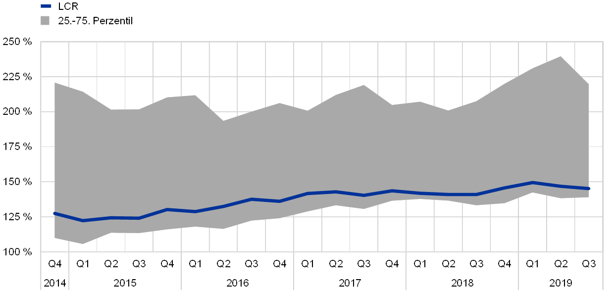 Die Liquiditätsdeckungsquote (liquidity coverage ratio – LCR) für die aggregierte Gruppe der bedeutenden Institute setzte ihren zuletzt verzeichneten Aufwärtstrend fort, was einem Anstieg um 4,23 Prozentpunkte gegenüber dem Vorjahreszeitraum entsprach (siehe Grafik 4).