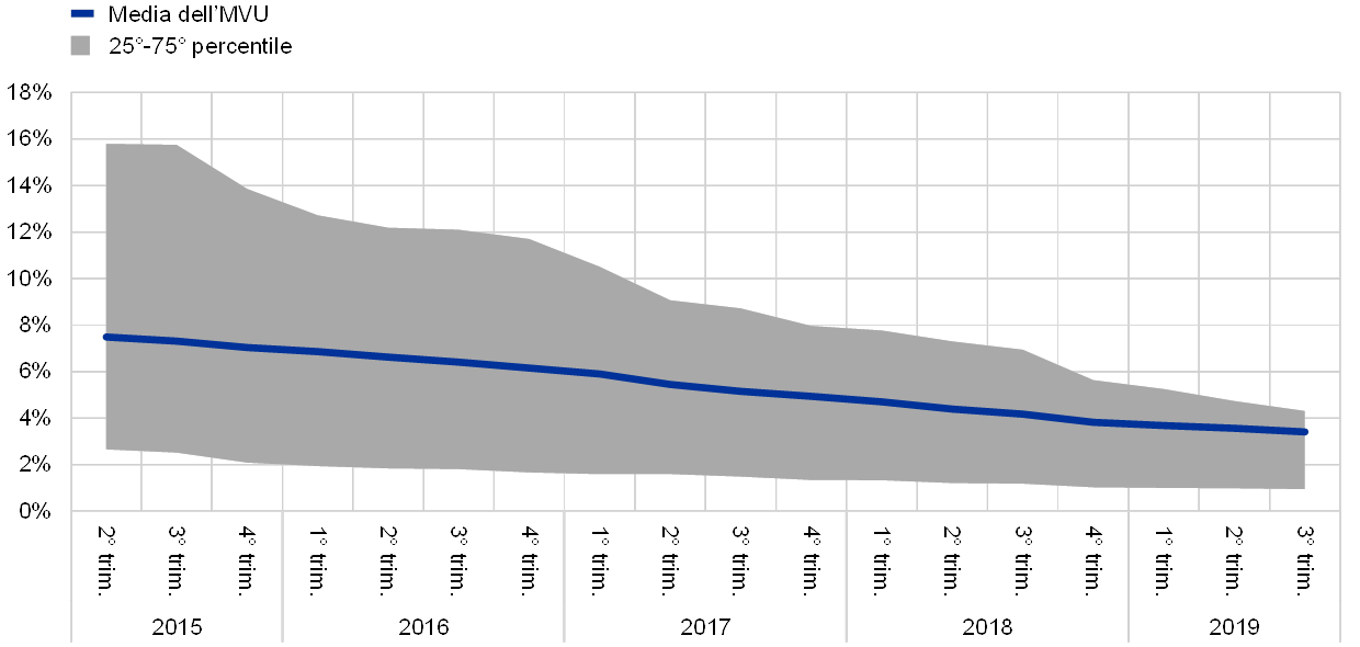 Infine, la qualità degli attivi delle banche è migliorata, con una costante e generale diminuzione dell’incidenza dei crediti deteriorati, dal 4,17 per cento nel terzo trimestre del 2018 al 3,41 nello stesso periodo del 2019 (cfr. il grafico 7 e la sezione 1.2.2). Nello stesso periodo anche la dispersione tra le banche dell’incidenza dei crediti deteriorati ha registrato un notevole calo, come indicato nel grafico 8.