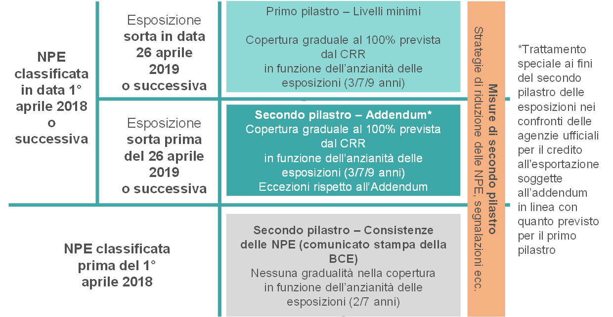 - Va tenuto presente che in questo documento i concetti di “esposizione deteriorata” (non‑performing exposure, NPE) e “credito deteriorato” (non‑performing loan, NPL) sono utilizzati indifferentemente. La ragione di tale scelta è spiegata nella nota 1 della Comunicazione in merito alle aspettative di vigilanza sulla copertura delle NPE.