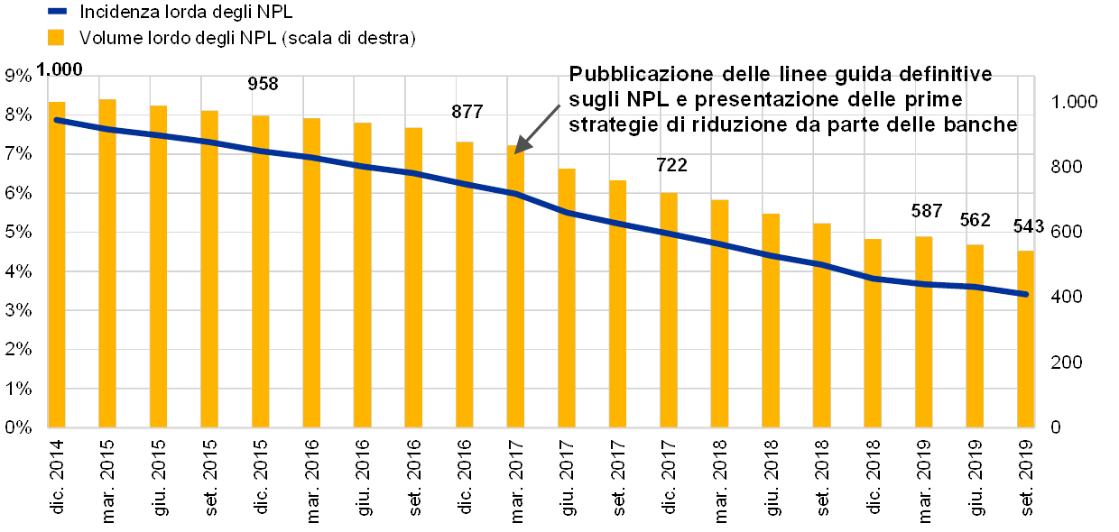- Secondo dati interni e statistiche bancarie di vigilanza della BCE, se si considerano soltanto gli enti significativi vigilati nell’ambito dell’MVU, tra il quarto trimestre del 2014 e il secondo trimestre del 2019, l’incidenza di crediti deteriorati è diminuita dal 17,1 all’8,0 per cento in Italia, dal 23,9 al 4,1 per cento in Irlanda, dall’8,0 al 3,5 per cento in Spagna, dal 39,68 al 39,24 per cento in Grecia, dal 50,8 al 18,6 per cento a Cipro e dal 17,15 per cento al 10,59 per cento in Portogallo.