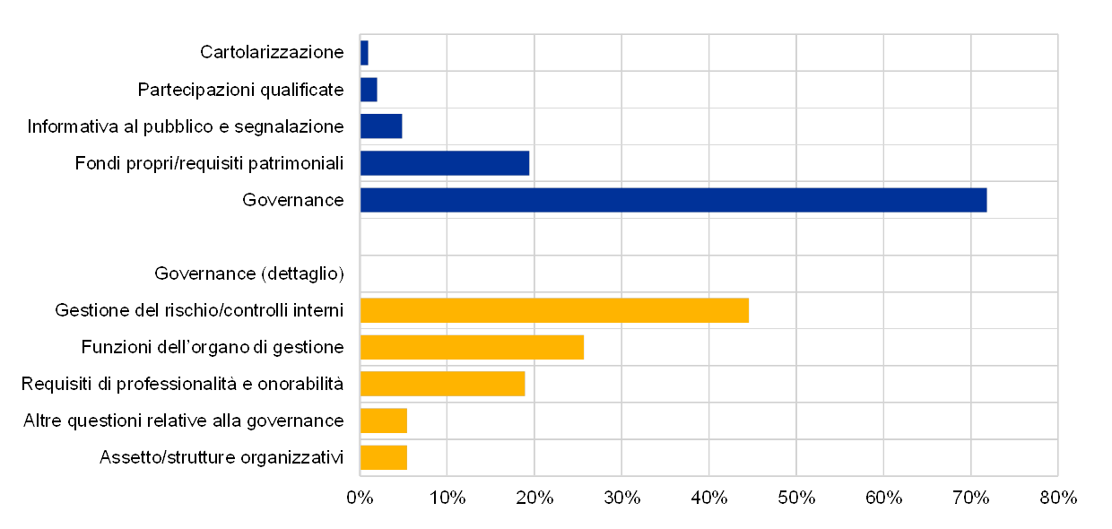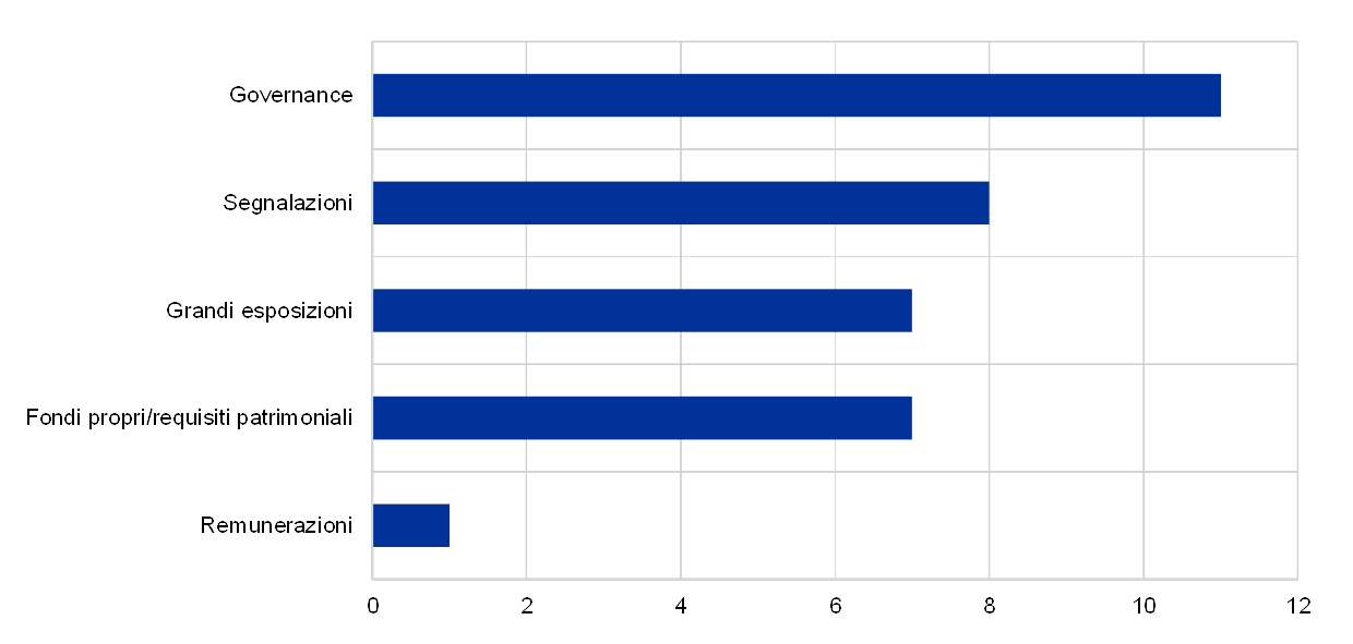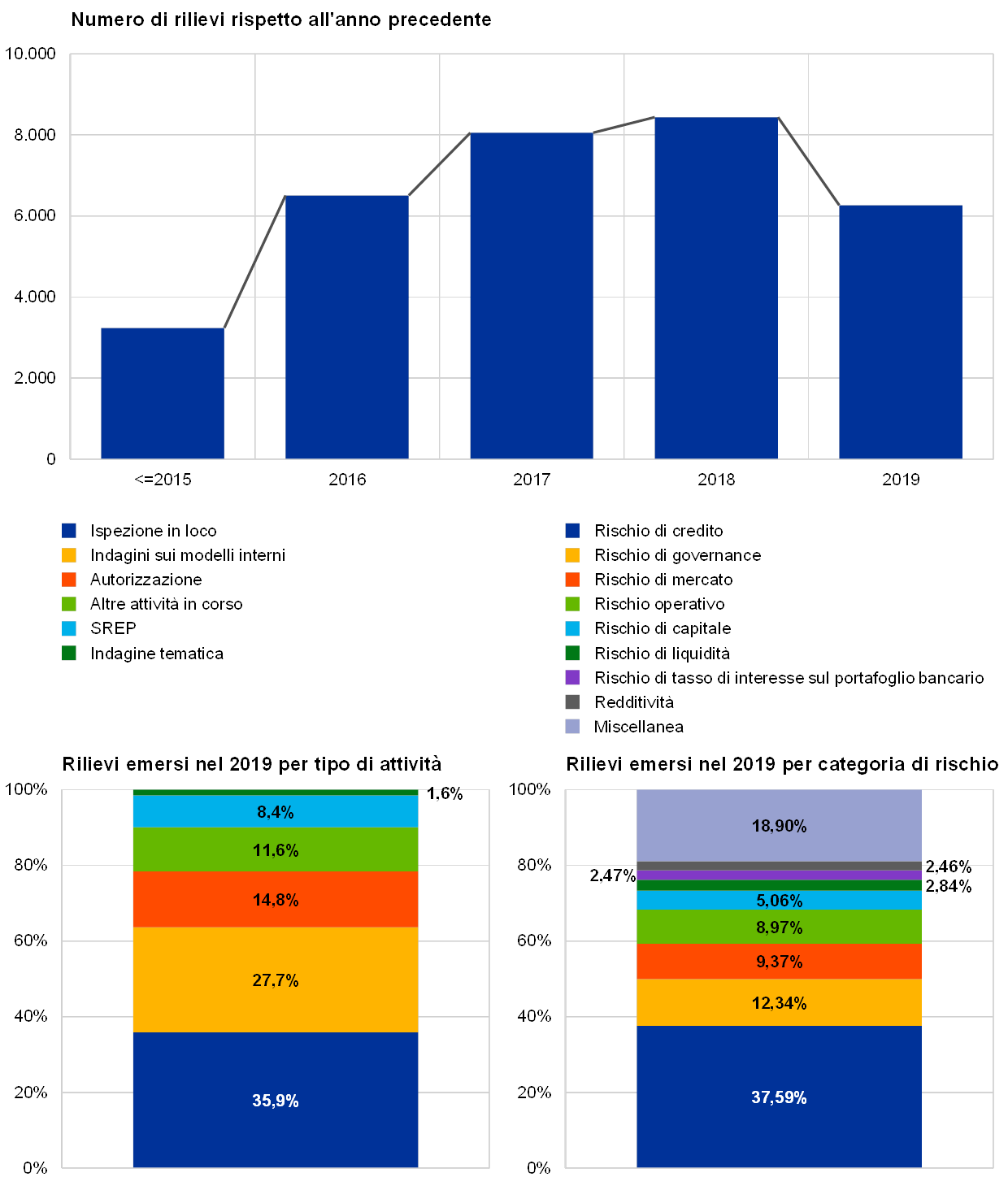 - Tale diminuzione è riconducibile a due principali fattori: a) il mancato completamento di rassegne tematiche nel 2019, che elimina una delle fonti dei rilievi e b) il fatto che i rilievi derivanti dalle indagini sui modelli interni vengono ora integrati in una fase successiva del processo, con una conseguente riduzione una tantum del numero di tali rilievi nel 2019.