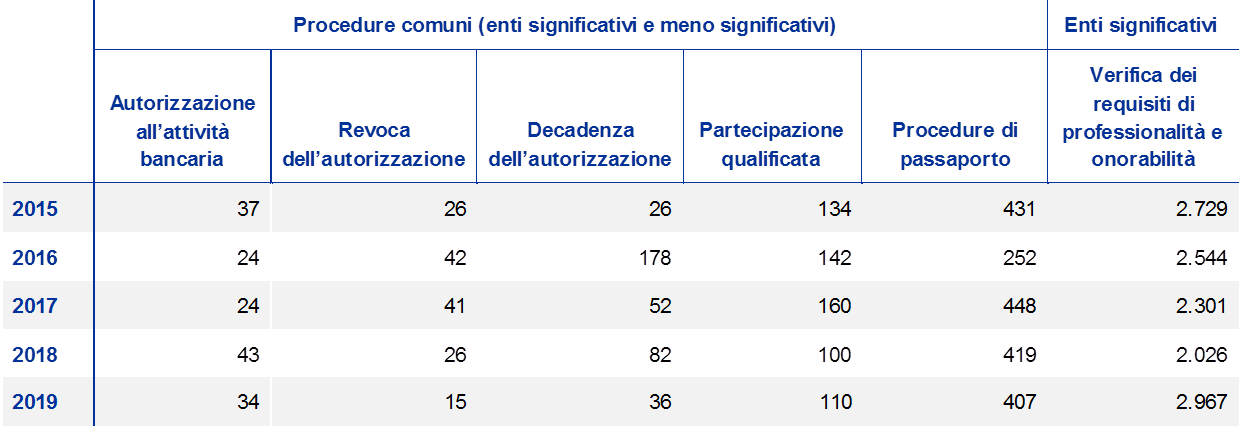 - Alcune decisioni riguardano più di una valutazione per autorizzazione (ad es. verifiche dei requisiti di professionalità e onorabilità di diversi esponenti dello stesso ente significativo o acquisizioni di partecipazioni qualificate in diverse filiazioni derivanti da una singola operazione). Alcune procedure di autorizzazione non richiedono una decisione formale da parte della BCE; in particolare è il caso delle procedure di passaporto e di decadenza dell’autorizzazione.