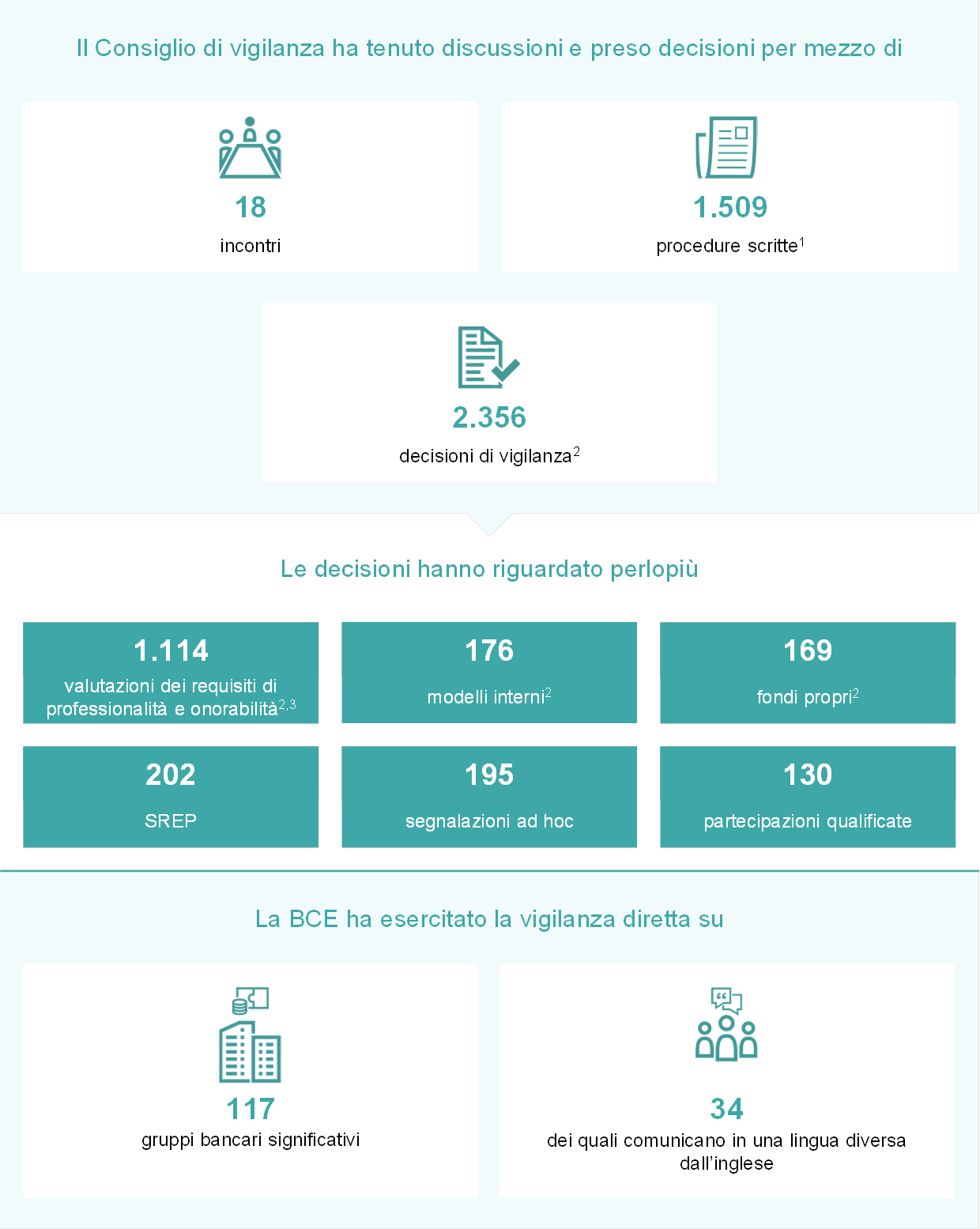 - Oltre a tali decisioni di vigilanza, la BCE ha anche implicitamente approvato 205 operazioni (come l’istituzione di succursali) non obiettando entro i termini di legge; di queste, 103 sono state approvate dall’alta dirigenza nell’ambito del quadro normativo di delega.