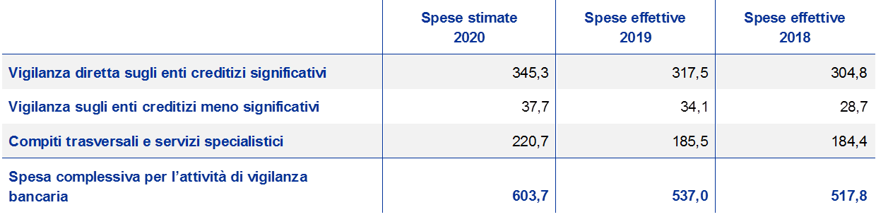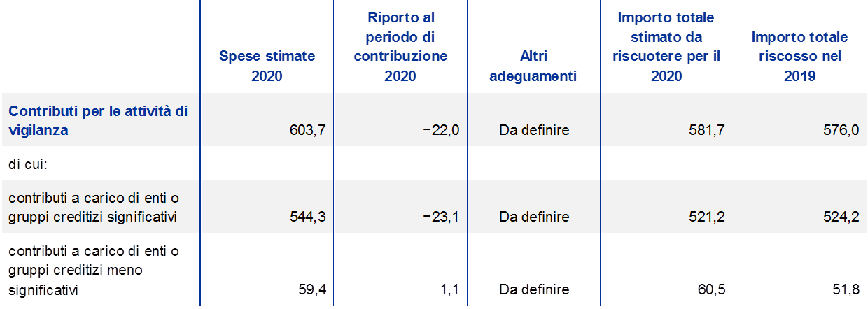 - A partire dal periodo di contribuzione 2020, i contributi per le attività di vigilanza della BCE saranno calcolati tenendo conto dei costi annuali effettivi, vale a dire dopo la chiusura del periodo. Cfr. la sezione 6.2 per ulteriori informazioni sulle modifiche apportate al regime di contribuzione.