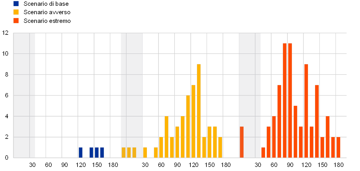 Note: il periodo di sopravvivenza è definito come il periodo fino al primo giorno in cui i deflussi netti di liquidità cumulati superano la capacità di compensazione disponibile. Più lungo è il periodo di sopravvivenza, migliore è la prospettiva della banca di sopravvivere a uno shock di liquidità.