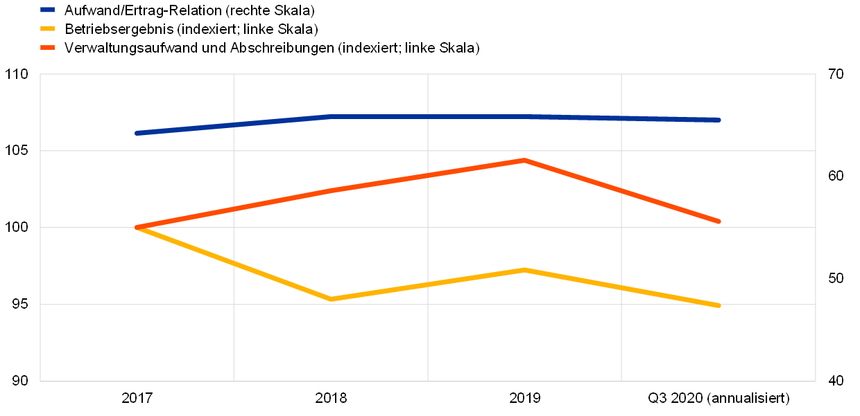 Auch die Verschuldungsquote hat sich im Pandemieverlauf auf aggregierter Basis als robust erwiesen. Sie lag im dritten Quartal 2020 bei 5,6 %, verglichen mit 5,7 % Ende 2019. Allerdings dürften Risiken bezüglich der Angemessenheit der Kapitalausstattung erst später in den Bankbilanzen zum Tragen kommen. Eine verstärkende Wirkung könnten dabei Klippeneffekte ausüben, wenn die 2020 ergriffenen Unterstützungsmaßnahmen (wie etwa Moratorien, befristete Freistellungen, staatliche Garantien und sonstige regulatorische Übergangsregelungen) auslaufen.[2]