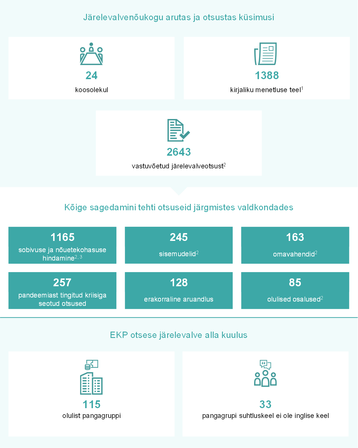 - Nimetatud otsused viitavad aruandeperioodil lõpetatud või vastu võetud otsustele (st väljaminevad otsused). Järelevalveotsuste arv ei vasta nende tegevusloamenetluste arvule, millest EKPd aruandeperioodil ametlikult teavitati (st sissetulevad teatamismenetlused).