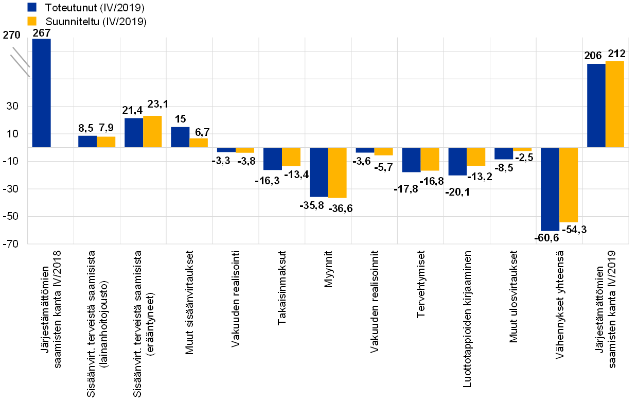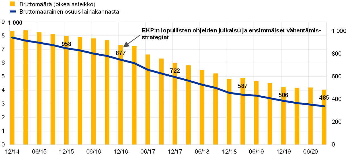 Rahoitusolojen helpottamiseksi ja kotitalouksien, pienyritysten ja muiden yritysten tukemiseksi tehdyt poikkeukselliset toimet vaikuttivat myös siihen, että järjestämättömien saamisten määrä pankkien taseissa kokonaisuutena pysyi koko vuoden melko samana. Järjestämättömien saamisten määrän arvellaan kuitenkin kasvavan tulevaisuudessa, kun tukitoimet lakkaavat. Tähän liittyen EKP:n pankkivalvonta painotti heinä- ja joulukuussa pankeille lähettämissään kirjeissä[4], että pankkien tulisi tarjota elinkelpoisille talousvaikeuksiin joutuneille yrityksille kestäviä ratkaisuja oikea-aikaisesti, jotta pankit voivat vähentää ongelmaluottojen kertymistä ja minimoida tukitoimien päättymisen mahdollisesti laukaisemat äkilliset vaikutukset mahdollisuuksien mukaan. Tätä varten pankkien tulisi varmistaa, että riskien arvioiminen, luokittelu ja mittaaminen on toteutettu taseessa asianmukaisesti. Pankkien tulisi käyttää tehokkaita riskienhallintakäytäntöjä, joilla ne voivat tunnistaa, arvioida ja toteuttaa velallisia parhaiten tukevia ratkaisuja, ja suojautua samalla myös luottoriskin negatiivisilta vaikutuksilta. Samalla pankkien tulisi myös tehokkaasti hallita järjestämättömien luottojen kantaa, joka niillä oli jo ennen pandemian puhkeamista.
