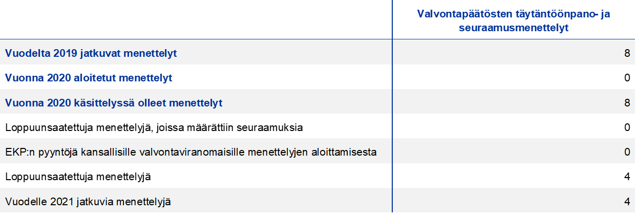 - Päätökset, jotka loppuunsaatettiin tai hyväksyttiin raportointijakson aikana. Valvontapäätösten määrä ei ole sama kuin EKP:lle raportointijakson aikana virallisesti ilmoitettujen lupahakemusten määrä.