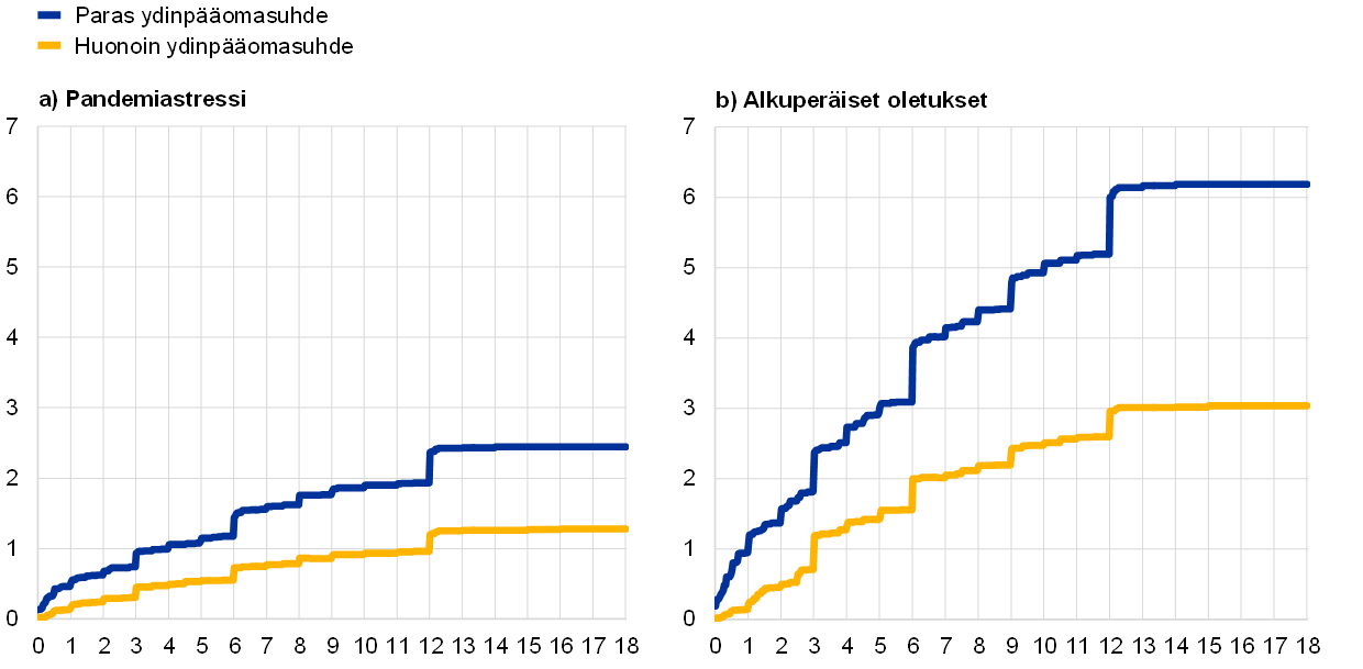 Haavoittuvuusanalyysissa testattiin kahta pandemiaan liittyvää skenaariota, jotka kattoivat pääosan koronaviruskriisin vuoksi toteutettujen rahapoliittisten, valvonnallisten ja finanssipoliittisten tukitoimien vaikutuksesta. Skenaariossa, joka eurojärjestelmän asiantuntijoiden mukaan on todennäköisin, merkittävien laitosten keskimääräinen ydinpääomasuhde laski 14,5 prosentista 12,6 prosenttiin. Se osoittaa, että yhteisen valvontamekanismin piirissä olevien pankkien pääomataso on tällä hetkellä riittävä lyhytaikaisesta syvästä taantumasta selviämiseen. Nykyisillä pääomapuskureilla pankkisektori kokonaisuutena voisi selvitä myös vakavasta skenaariosta, jossa oletuksina olivat syvempi taantuma ja talouden hitaampi elpyminen. Tässä skenaariossa pankkien keskimääräinen ydinpääomasuhde laski 14,5 prosentista 8,8 prosenttiin. Vakavassa skenaariossa jotkin pankit joutuisivat kuitenkin toteuttamaan lisätoimia vähimmäispääomavaatimusten täyttämiseksi.