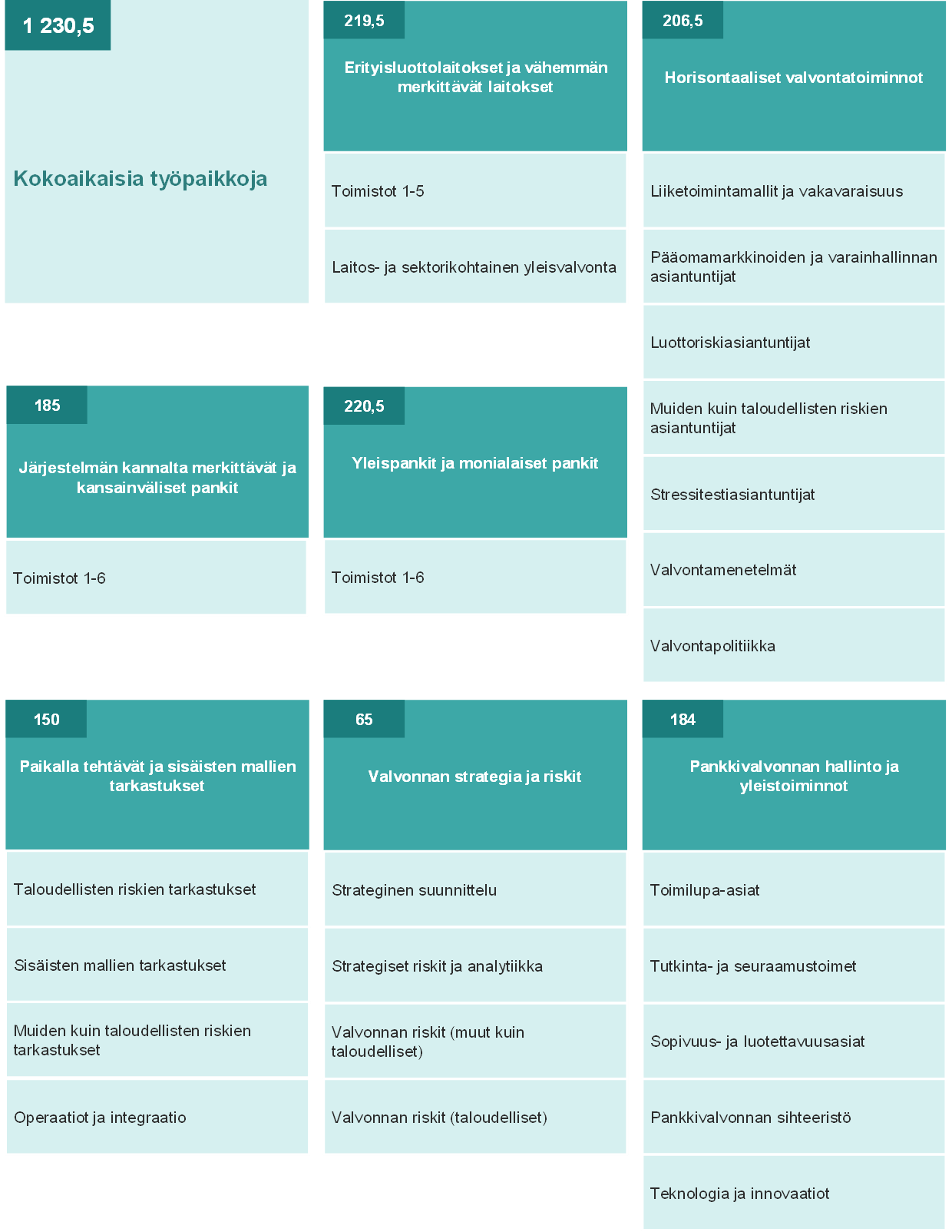 - Yksi keskeinen periaate oli, että jos toimistossa on enemmän kuin 15 työntekijää (budjetoidut kokoaikaiset työpaikat), on syytä harkita osaston perustamista. Laitoskohtaisen suoran valvonnan toimialoilla osasto voidaan perustaa, jos työntekijöitä on vähintään kuusi. Muilla pankkivalvonnan toimialoilla osasto voidaan perustaa, jos työntekijöitä on 8-10. Näin osastojen ja toimistojen johtamista voidaan yhtenäistää.