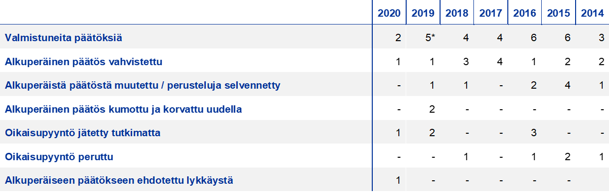 - Edellisiin vuosiin verrattuna määrät ovat pienemmät, mikä johtuu paikalla tehtävien tarkastusten keskeytymisestä koronaviruspandemian vuoksi.