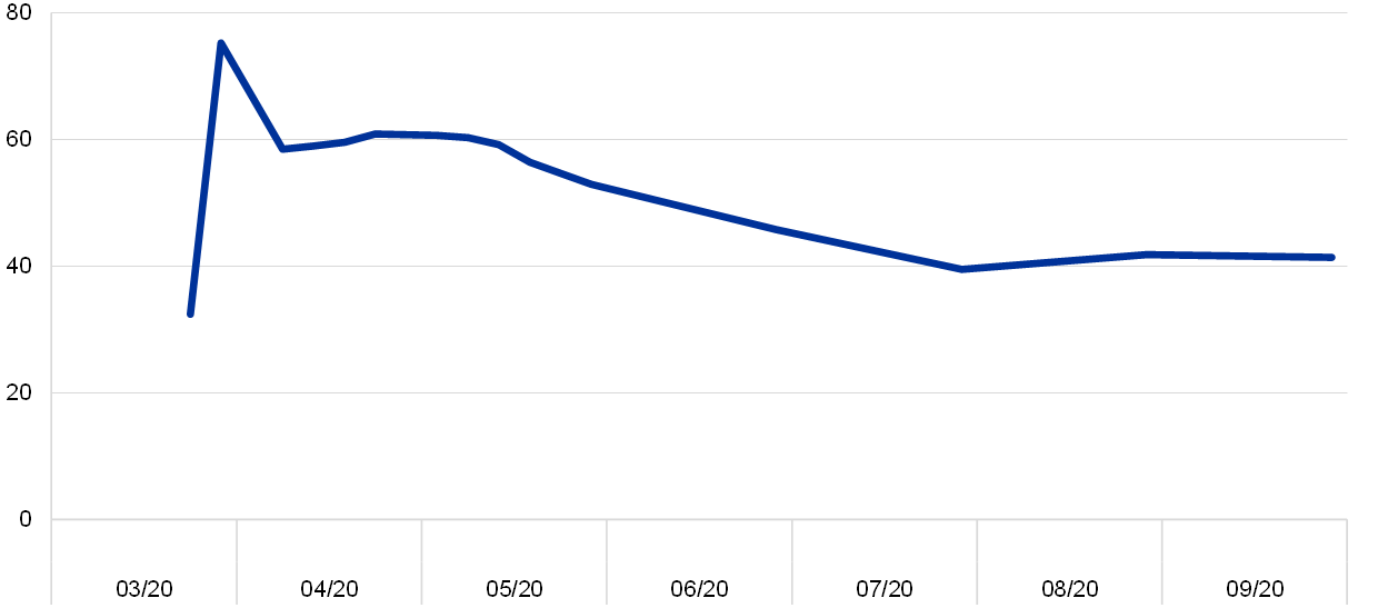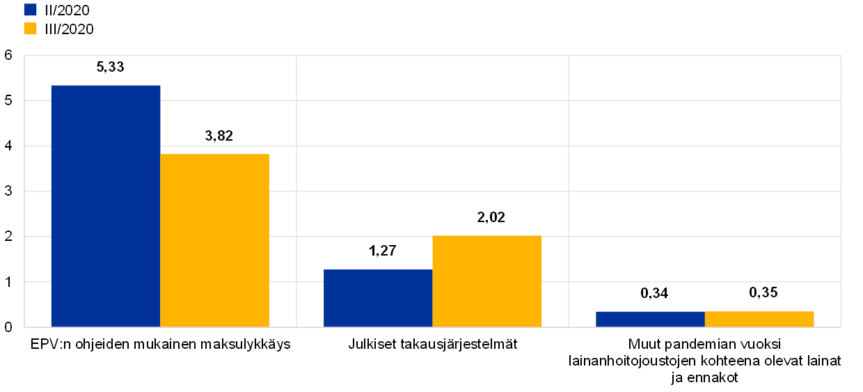 Kaiken kaikkiaan EKP:n toteuttamat pääomiin ja maksuvalmiuteen kohdistuvat toimet sekä viranomaisten toteuttamat poikkeukselliset julkiset tukitoimet pandemian alkuvaiheessa auttoivat pankkeja selviämään luottoriskin kasvusta ja jatkamaan reaalitalouden tarvitseman rahoituksen tarjoamista. Lainat ja ennakkomaksut kotitalouksille ja rahoitussektorin ulkopuolisille yrityksille pysyivät pääosin ennallaan pandemian alkamisesta lähtien (-1,3 % yritysten osalta ja +0,8 % kotitalouksien osalta maaliskuusta syyskuuhun 2020). Julkiset takaukset olivat erityisen tärkeitä rahoituksen tarjoamisessa rahoitussektorin ulkopuolisille yrityksille (260 miljardia euroa syyskuussa 2020).