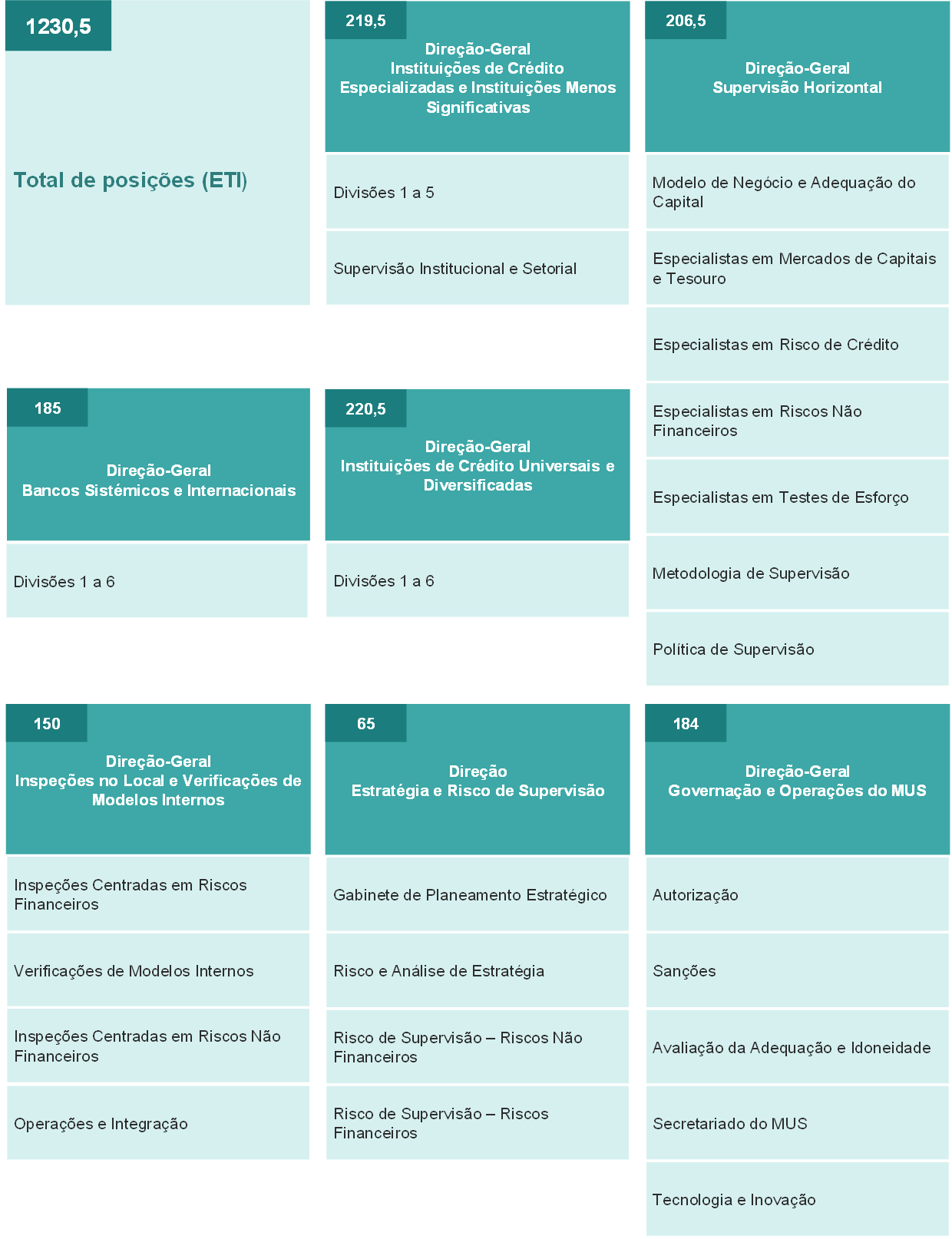 Para atingir este objetivo, estruturámos as direções‑gerais responsáveis pela supervisão específica das instituições de crédito de acordo com os modelos de negócio das instituições supervisionadas. Criámos uma nova direção, a Direção de Estratégia e Risco de Supervisão, responsável pelo planeamento estratégico e por propor prioridades prudenciais e assegurar um tratamento coerente de todas as instituições de crédito. Criámos igualmente uma direção‑geral específica para as atividades de supervisão no local – a Direção‑Geral de Inspeções no Local e Verificações de Modelos Internos – e incumbimos a Direção‑Geral de Supervisão Horizontal de reforçar as competências das ECS em matéria de riscos, realizar avaliações comparativas, definir políticas e assegurar a manutenção das metodologias. Uma direção‑geral separada, a Direção‑Geral de Governação e Operações do MUS, apoia a tomada de decisões e a inovação prudencial e gere os procedimentos de autorização. A reorganização visou simplificar processos e integrar inovações tecnológicas na supervisão a nível dos vários departamentos.