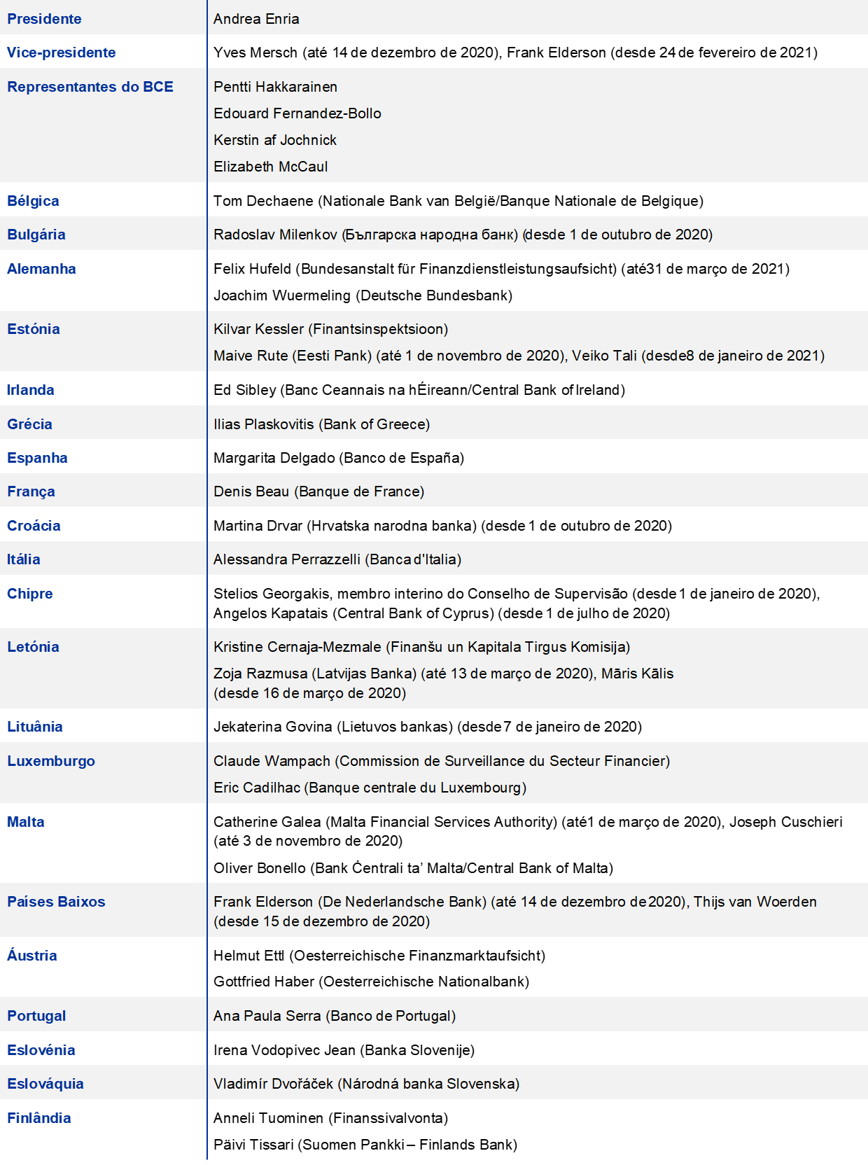 Para nós significa que, desde outubro de 2020 e após a conclusão da avaliação completa aplicável, o BCE supervisiona diretamente cinco instituições de crédito na Bulgária e oito na Croácia. Os supervisores búlgaros e croatas tornaram‑se membros das ECS relevantes e representantes dos dois países passaram a integrar o Conselho de Supervisão, com os mesmos direitos e obrigações, incluindo direitos de voto, que os restantes membros. Foi com muito prazer que lhes demos as boas‑vindas à “família”!
