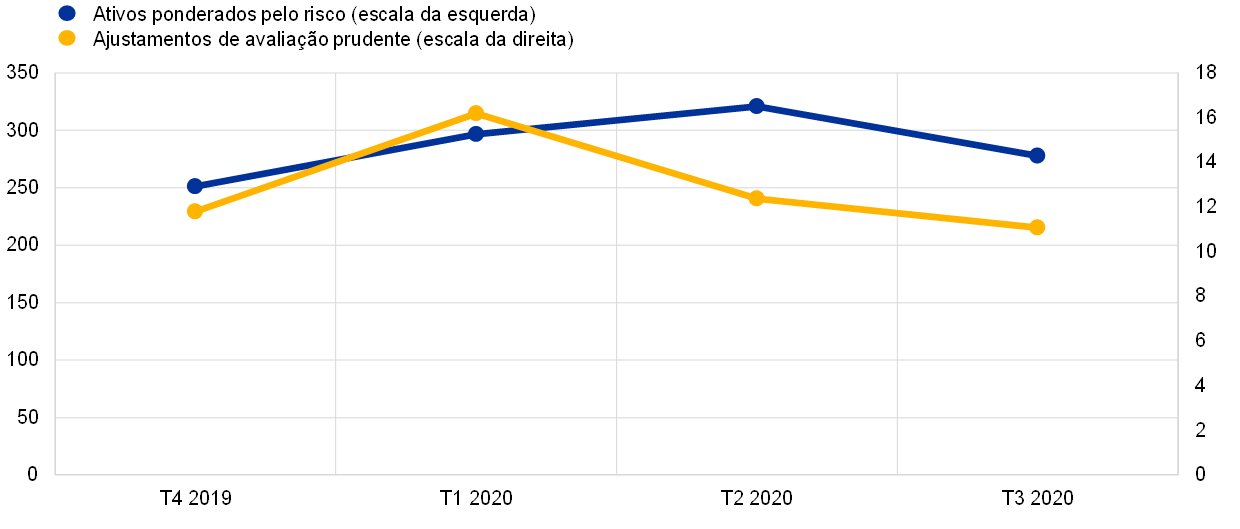 O surto pandémico de COVID‑19 na Europa e nos Estados Unidos levou a um colapso dos preços das ações, a uma intensificação abrupta da volatilidade e a um aumento generalizado dos diferenciais de crédito de emitentes soberanos e de empresas ao longo de março de 2020. Tal teve um impacto negativo não apenas nos balanços das instituições de crédito, mas também nos respetivos requisitos de fundos próprios para o risco de mercado determinados com base em modelos internos, bem como nos seus ajustamentos de avaliação prudente (prudent valuation adjustments – PVA), especialmente no que respeita à incerteza do preço de mercado e ao risco de modelo, estando esses ajustamentos correlacionados com a volatilidade recente. Em resposta ao choque, foram tomadas medidas de flexibilização prudencial, no sentido de limitar os efeitos procíclicos da crise nos requisitos de fundos próprios para o risco de mercado e nos ajustamentos de avaliação (por exemplo, a exclusão de determinados casos de excesso constatados nas verificações a posteriori de modelos internos e o aumento dos benefícios de diversificação nos ajustamentos de avaliação prudente). A melhoria das condições do mercado no segundo e terceiro trimestres também proporcionou apoio adicional.