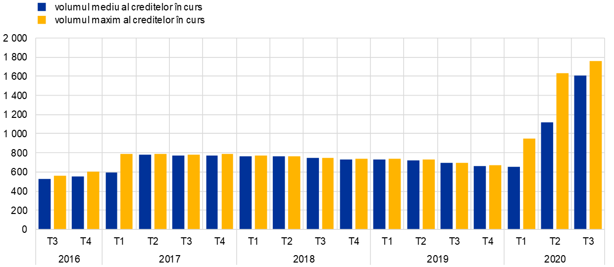 Ca parte a răspunsului său la criza generată de pandemia de COVID-19, Supravegherea bancară a BCE a permis, de asemenea, băncilor să își utilizeze rezervele de lichiditate reglementate, funcționând temporar sub nivelul cerinței privind indicatorul de acoperire a necesarului de lichiditate (liquidity coverage ratio – LCR).[3] În paralel, o orientare foarte acomodativă a politicii monetare, inclusiv o relaxare a normelor de eligibilitate a garanțiilor, a asigurat accesul pe scară largă la finanțarea acordată de banca centrală băncilor aflate sub supravegherea bancară europeană. Volumul mediu al creditelor în curs acordate de Eurosistem a crescut de la 659 de miliarde EUR în trimestrul IV 2019 la 1 605 miliarde EUR în trimestrul III 2020 (Graficul 3).