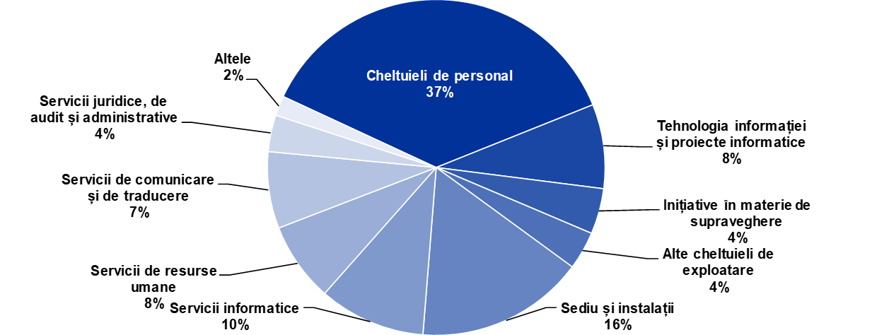 - Aceste servicii comune includ serviciile privind sediul și instalațiile, administrarea resurselor umane, servicii administrative, buget și control, servicii contabile, juridice, de comunicare și de traducere, audit intern, servicii statistice și de tehnologia informației.