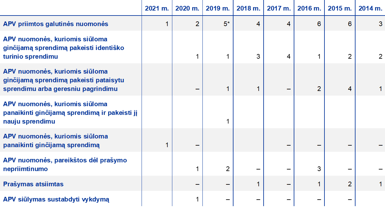 - Šie sprendimai reiškia sprendimus, kurie buvo galutinai priimti arba priimti per ataskaitinį laikotarpį (t. y. ankstesni sprendimai). Priežiūros sprendimų skaičius neatitinka leidimų suteikimo procedūrų, apie kurias per ataskaitinį laikotarpį buvo oficialiai pranešta ECB, skaičiaus (t. y. gaunamų pranešimų procedūros).