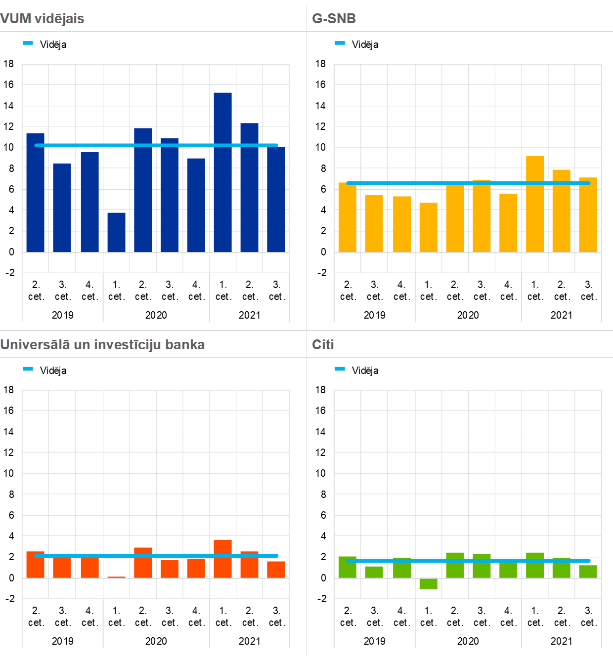 Piezīmes: "VUM vidējā" izlasē ir iekļautas visas nozīmīgās iestādes ar augstāko vienotā uzraudzības mehānisma konsolidācijas līmeni (dažāda izlase); attēli "G-SNB", "Universālā un investīciju banka" un "Citi" atspoguļo apakšizlasi ar attiecīgajiem uzņēmējdarbības modeļiem.