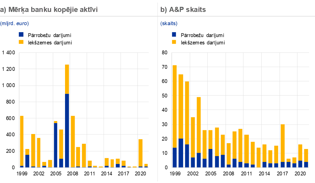 Piezīmes: Izlasē iekļauti A&P darījumi, kuros iesaistītas NI un MNI eirozonā, izņemot dažus privātus darījumus un darījumus starp mazām bankām, par kuriem nav ziņots Dealogic. No izlases tika izņemti darījumi, kas saistīti ar banku noregulējumu vai grūtībās nonākušo banku apvienošanos. Par darījumiem tiek ziņots, pamatojoties uz gadu, kurā tie tika izziņoti.