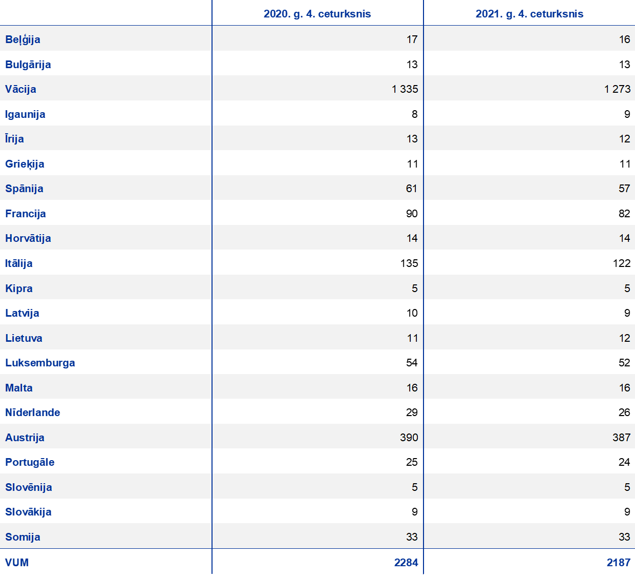 - MNI skaits 2021. gadā samazinājies arī Brexit dēļ; kopš 2021. gada 1. janvāra Apvienotās Karalistes filiāles tiek uzskatītas par trešo valstu filiālēm, kas nozīmē, ka tās vairs neietilpst VUM MNI sektorā.
