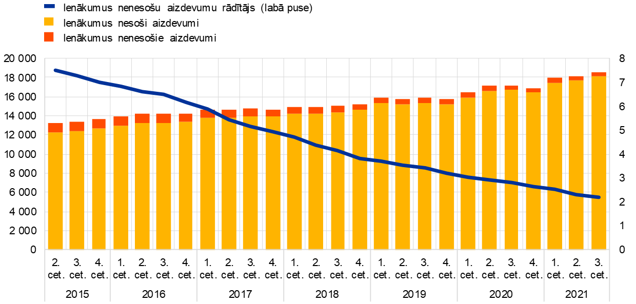 Bankas atbalstīja klientu kreditēšanu visā krīzes laikā, un līdz tam nav bijusi būtiska ietekme uz aktīvu kvalitāti. Vispārējo pozitīvo aktīvu kvalitātes tendenci (3. attēls) ir veicinājuši vairāki faktori, tostarp vēsturiski esošo ienākumus nenesošo kredītu (INK) nepārtrauktais samazinājums bankās ar augstu INK rādītāju, kā arī kreditēšanas ar valsts garantijām pieaugums un citi aizņēmēju atbalsta pasākumi. Šajā sakarā virkne ar Covid-19 saistīto ārkārtas atbalsta pasākumu, kas tika ieviesti, lai atvieglotu finansēšanas nosacījumus un atbalstītu mājsaimniecības, mazos uzņēmumus, kā arī korporatīvos uzņēmumus 2020. un 2021. gadā, palīdzēja novērst bankrotu un INK pieaugumu. Tomēr ECB banku uzraudzība joprojām ir nobažījusies par banku aktīvu kvalitāti vidējā termiņā, jo pandēmijas ietekme varēs pilnībā izpausties tikai tad, kad lielākā daļa ārkārtas valsts atbalsta pasākumu tiks atsaukti. Aizdevumu, kas tiek klasificēti kā nepietiekami ienesīgi (2. stadija), joprojām ir vairāk nekā pirms pandēmijas, un šķiet, ka aizdevumiem, kas ir guvuši labumu no Covid-19 atbalsta pasākumiem, ir nedaudz augstāks riska profils. Turklāt būtisks parāda līmeņa pieaugums dažādos ekonomikas segmentos var radīt augstākus maksātnespējas riskus, jo īpaši ekonomikas nozarēs vai valstīs, kuras pandēmija ir skārusi smagāk. Šajā kontekstā, veicot kredītriska uzraudzības darbu 2021. gadā, ECB uzsvēra, ka liela uzmanība jāpievērš stabilai kredītriska pārvaldības praksei.[2]