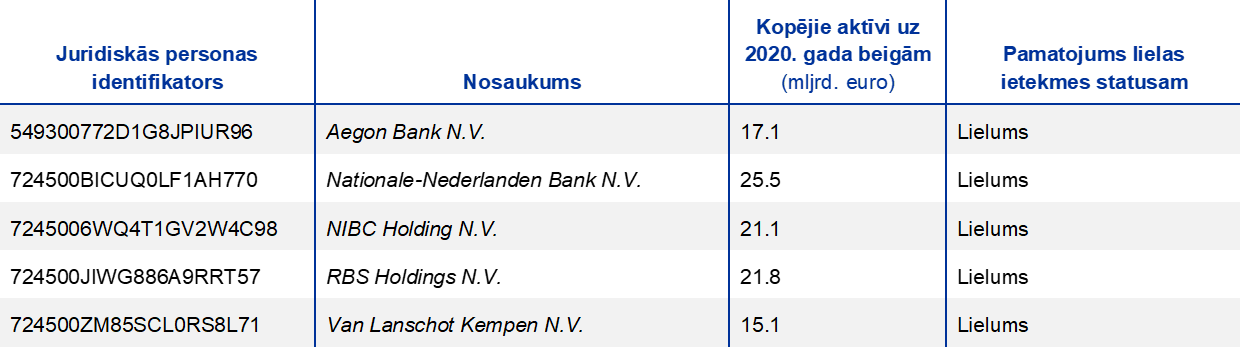 - 2021. gada decembrī publicētais nozīmīgo iestāžu (NI) un mazāk nozīmīgo iestāžu (MNI) saraksts atspoguļo: i) lēmumus par nozīmīgumu, kas tika paziņoti uzraudzītajām iestādēm pirms 2021. gada 30. novembra; ii) citas pārmaiņas un jaunāko informāciju par izmaiņām grupu struktūrā, kas bija spēkā līdz 2021. gada 1. novembrim.