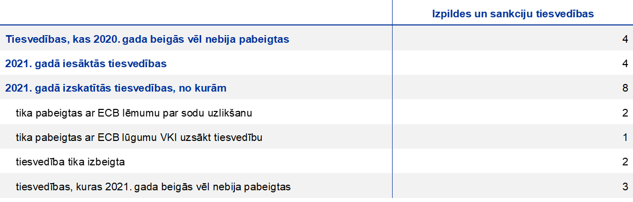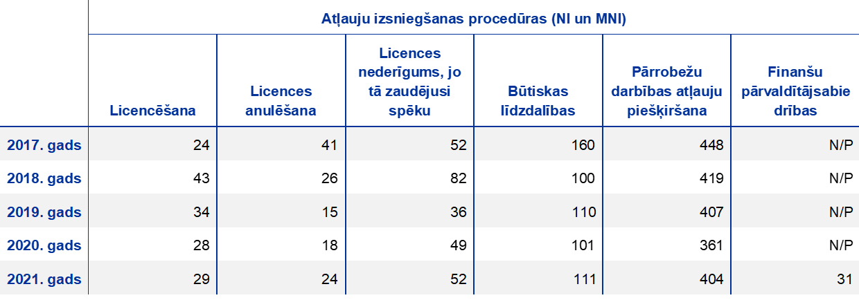- Šie lēmumi attiecas uz lēmumiem, kas tika pabeigti vai pieņemti pārskata periodā (t. i., izejošie lēmumi). Uzraudzības lēmumu skaits neatbilst pārskata periodā ECB oficiāli paziņoto atļauju izsniegšanas procedūru skaitam (t. i., ienākošās paziņojuma procedūras).