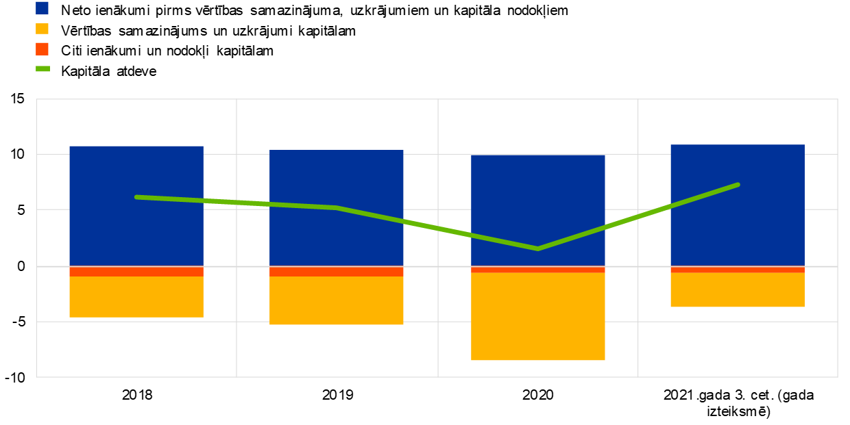 Pēc zemākā līmeņa sasniegšanas 2020. gadā pandēmijas kulminācijas laikā Eiropas banku uzraudzībā esošo NI rentabilitāte 2021. gadā atjaunojās. Banku kopējā ikgadējā kapitāla atdeve pieauga līdz 7.2% (7. attēls), kas ir augstākais līmenis vairāku gadu laikā, taču joprojām bija zemāks par banku vidējām pašu kapitāla izmaksām. Šo pieaugumu galvenokārt noteica cikliska vērtības samazināšanās plūsma, kas salīdzinājumā ar iepriekšējo gadu saruka vairāk nekā divkārt. 2020. gadā bankām bija jāieplāno būtiski piesardzības uzkrājumi, jo valdīja vēl nepieredzēta nenoteiktība par pandēmijas ietekmi. 2021. gadā šī prakse tika apturēta vai atsevišķos gadījumos pat mainīta, ņemot vērā gada laikā novēroto ekonomikas atveseļošanos.