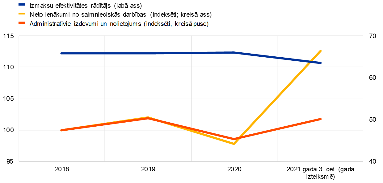 Ekonomikas atveseļošanās veicināja arī ienākumus pirms vērtības samazināšanās, uzkrājumiem un nodokļiem, kas atguvās līdz pirmspandēmijas līmenim. To galvenokārt noteica banku ienākumu pieaugums no tirdzniecības un ieguldījumiem, kā arī tīrie ienākumi no maksām un komisijām, turklāt galvenā loma bija ar aktīvu pārvaldīšanu saistītajām maksām. Turpretim tīrie procentu ienākumi joprojām bija mēreni un zem pirmspandēmijas līmeņa, jo bija pastāvīgs spiediens uz banku aizdevumu normām. Kopumā bankām izdevās palielināt neto darbības ienākumus par 15% (8. attēls). Šis ienākumu pieaugums bija galvenais banku izmaksu efektivitātes uzlabošanā, izmaksu un ienākumu attiecībai 2021. gadā samazinoties par vairāk nekā 2 procentu punktiem un sasniedzot 63.5%.