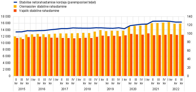 Stabiilse netorahastamise kordaja oli samal kuupäeval 127,1%, mis oli üldjoontes kooskõlas 2021. aastal täheldatud väärtustega ning ületas vaevata pandeemiaeelset taset ja miinimumnõudeid (diagramm 7).