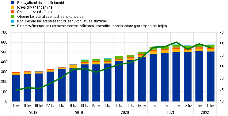 Oluliste krediidiasutuste finantsvõimenduse koondmäär oli 2022. aasta kolmandas kvartalis 5,2% juures (diagramm 2), mis on üks madalamaid tasemeid, mida on Euroopa pangandusjärelevalve tegevuse algusest saadik nähtud, kuid ületab siiski tunduvalt regulatiivseid nõudeid ja puhvreid. 2022. aasta esimeses kolmes kvartalis toimunud langus (–90 baaspunkti) oli suuresti tingitud nõuete suurenemisest, mis kajastas varade kasvu pangandussektoris, kuid ka finantsvõimenduse määra arvutamisel keskpankade vastu olevatele nõuetele kohaldatava erandi aegumisest 2022. aasta märtsi lõpus, ehkki vähemal määral. Vähem oluliste krediidiasutuste finantsvõimenduse koondmäär oli 2022. aasta kolmandas kvartalis 8,6% ehk 2021. aasta kolmanda kvartaliga võrreldes madalam.