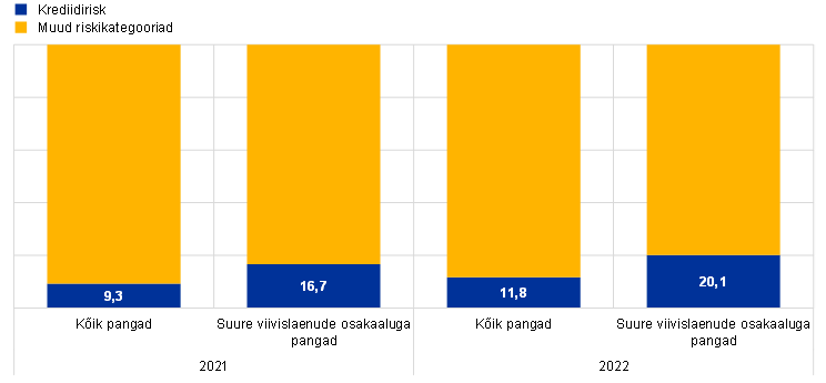 Varade kvaliteet paranes 2022. aastal jätkuvalt. Kuna ei leidu märke olulisest realiseerunud krediidiriski tasemest ja arvestades pandeemia ajal moodustatud märkimisväärseid eraldisi, hakkas keskmine riskikulu, mis oli Venemaa-Ukraina sõja alguses veidi kasvanud, 2022. aasta teises ja kolmandas kvartalis taas kahanema, jõudes üldiselt tagasi pandeemiaeelsele tasemele. Lisaks sellele vähenes viivislaenude maht 2022. aasta esimesel poolel peaaegu kõigis portfellides, kuigi kolmandas kvartalis toimus väike kasv tarbija- ning väikeste ja keskmise suurusega ettevõtete (VKEde) portfellides. Kuigi mittenõuetekohaselt teenindatavate laenude ehk raamatupidamise mõistes teise etapi laenude arv kasvas mõningal määral, täheldati kolmanda kvartali lõpuks stabiilset suundumust, ehkki tase jäi pandeemia haripunktist kõrgemaks. Sellest positiivsest arengust hoolimata on edasine tee endiselt ebakindel, kusjuures mõned märgid viitavad suurenenud riskile, nimelt seoses sellega, et 2022. aasta kolmandas kvartalis hakkasid mõnes riigis tekkima väiksemad varased võlad. See võib osutada kõrgendatud krediidiriski kujunemisele ja viivislaenude mahu võimalikule suurenemisele lähitulevikus. Sellega seoses võetakse teise etapi laenude areng pideva järelevalve alla, eelkõige seoses pankadega, mis puutuvad kokku gaasi- ja energiahindade tõusu suhtes tundlike sektoritega, aga ka seoses selliste portfellidega nagu finantsvõimendus, tarbimislaenud ja kinnisvaralaenud, mis on tundlikud intressimäärade kiire normaliseerimise suhtes. Selles kontekstis mõjutas Venemaa sissetungist Ukrainasse põhjustatud energiahinnašokk üldiselt majandussektoreid, mis on seotud tooraine tootmise või töötlemisega, energiatarnijaid ja suure energiakasutusega sektoreid. Mõnes tööstusharus võib energiahinnašokk süvendada juba olemasolevaid tarneahela häireid, mis tulenevad COVID-19 piirangutest Hiinas ja üldisest mikrokiipide puudusest. Kõrged sisendhinnad pärssisid ka ehitustegevust ja võivad lisaks mõjutada suuri gaasitarbijaid, näiteks metalli-, kemikaalide, toidu- ja joogitootjaid. Järelevalvetegevus, milles keskendutakse sellele, et hinnata pankade meetmeid võimalike haavatavate portfellide haldamisel, jätkub.
