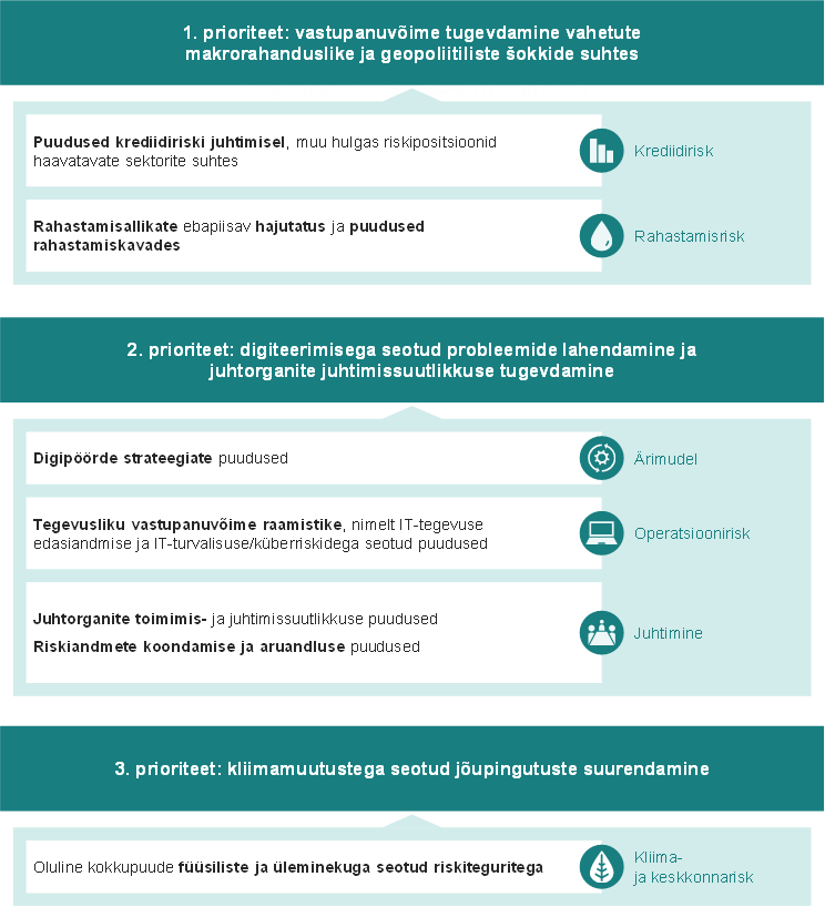 Teiseks oli mitmel pangal vaja veelgi parandada oma sisekontrollifunktsioone, eelkõige selleks, et tegeleda personalipuuduse, funktsiooni halva staatuse ja protsesside puudustega, näiteks vastavuskontrolliprogrammide ja pankade riskivalmiduse määratlusega. Meie 2022. aastal tehtud sihipärastes analüüsides vaadeldi pankade riskijuhtimistavasid valdkondades, mis on seotud pandeemiast tingitud kriisi ja intressimäärade normaliseerimisega, eelkõige seoses äri- ja elamukinnisvaralaenude andmise, pangaportfelli intressi- ja krediidimarginaali riskide ning vastaspoole krediidiriskiga.