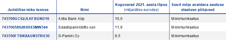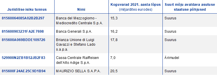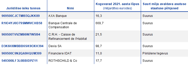 BNP Paribas, Deutsche Bank, Groupe BPCE, Groupe Crédit Agricole, ING Bank, Santander, Société Générale ja UniCredit. BNP Paribasile määratud kapitalipuhvri nõue langes võrreldes eelmise aasta 2,0%ga 1,5%ni. Vähendatud kapitalipuhvri nõuet kohaldatakse 1. jaanuarist 2023.