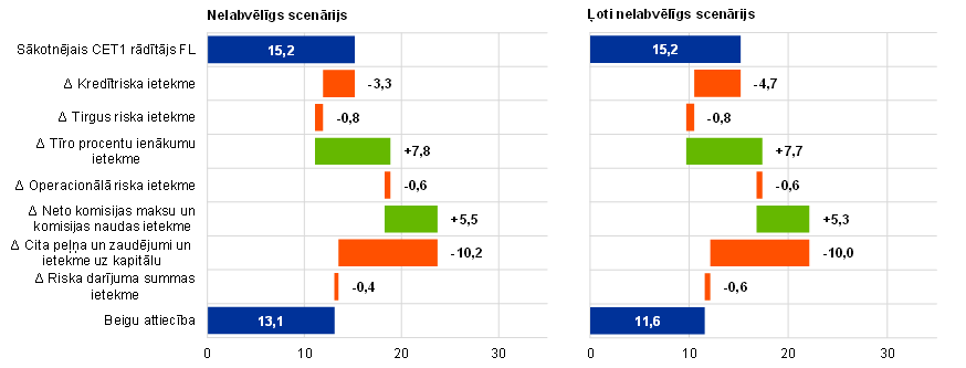 Piezīmes. Tirgus riska šoki un no tiem izrietošā ietekme, kā arī operacionālā riska ietekme abos scenārijos bija vienāda. Ietekme no tīrajiem maksu un komisiju ienākumiem atšķiras tikai nedaudz, ņemot vērā līdzīgus finanšu šokus abos scenārijos. Ietekmi uz pārējo peļņu un zaudējumiem, kā arī uz kapitālu rada izmaksu pozīcijas, kurām atvēlētie līdzekļi aplēšu periodā palika nemainīgi.