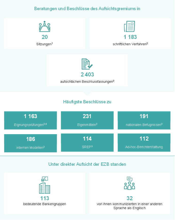 Diese Zahl bezieht sich auf die Beschlüsse, die im Berichtsjahr finalisiert oder verabschiedet wurden (ausgehende Aufsichtsbeschlüsse). Die Anzahl der Aufsichtsbeschlüsse entspricht nicht der Zahl der Erlaubnisverfahren, die der EZB im Berichtsjahr offiziell gemeldet wurden (eingehende Meldeverfahren). Ein Beschluss kann mehrere aufsichtliche Genehmigungen umfassen.