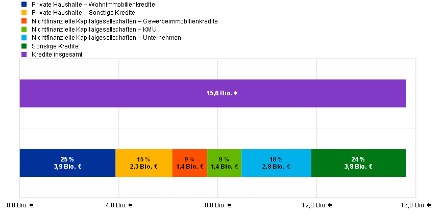 Anmerkung: Gewerbeimmobilienkredite gemäß Definition des Europäischen Ausschusses für Systemrisiken (ESRB). Hierbei handelt es sich um einen an eine juristische Person vergebenen Kredit, der entweder aufgenommen wird, um ein bestehendes oder in Entwicklung befindliches Renditeobjekt (bzw. mehrere als Renditeobjekte definierte Immobilien) oder eine bestehende oder im Bau befindliche Immobilie (bzw. mehrere solche Immobilien), die von den Eigentümern zum Zweck der Ausübung ihres Geschäfts, Geschäftsgegenstands oder ihrer Tätigkeit genutzt wird bzw. werden, zu erwerben oder der durch eine Gewerbeimmobilie (oder mehrere Gewerbeimmobilien) besichert ist. Die Risikopositionen in Gewerbeimmobilien wurden von den Risikopositionen in KMUs sowie in Unternehmen abgezogen. Bei den Wohnimmobilienkrediten an private Haushalte wurden lediglich hypothekarisch besicherte Darlehen berücksichtigt. Die Kategorie „Sonstige Kredite“ beinhaltet Zentralbanken, öffentliche Haushalte, Kreditinstitute und sonstige finanzielle Unternehmen.