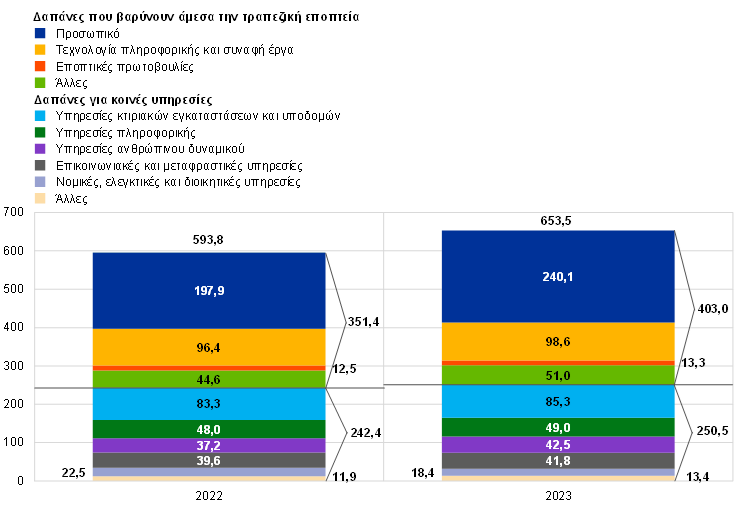 Το κόστος που συνδέεται με οριζόντια καθήκοντα και εξειδικευμένες υπηρεσίες επιμερίζεται αναλογικά, με βάση το πλήρες κόστος της άμεσης εποπτείας των σημαντικών ιδρυμάτων και το κόστος επίβλεψης της εποπτείας των λιγότερο σημαντικών ιδρυμάτων αντίστοιχα. Για κάθε κατηγορία, τα μεγέθη κόστους που αναφέρονται περιλαμβάνουν το αναλογούν τμήμα των κοινών υπηρεσιών που παρέχουν οι υποστηρικτικές υπηρεσιακές μονάδες της ΕΚΤ.