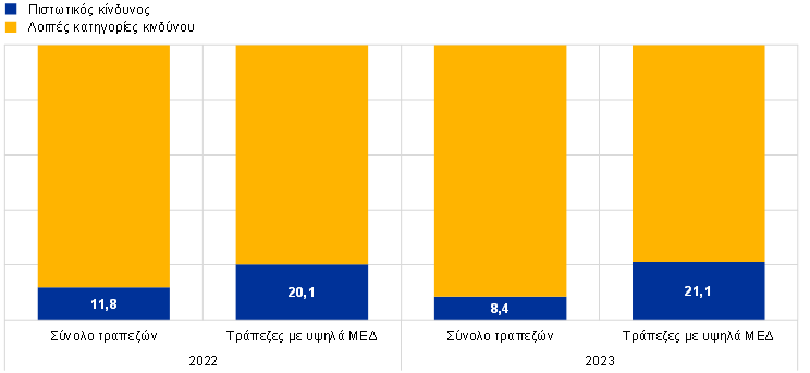 Παρά το γεγονός ότι ο δείκτης ΜΕΔ παρέμεινε συνολικά σταθερός στον κύκλο του 2023, η ΕΚΤ διαπίστωσε επιδείνωση στα χαρτοφυλάκια που εμφανίζουν μεγαλύτερη ευπάθεια στις πληθωριστικές πιέσεις, συμπεριλαμβανομένων των δανείων προς τα νοικοκυριά[4]. Παρατήρησε επίσης κάμψη στις αγορές επαγγελματικών ακινήτων,[5] καθώς και αυξημένες πιέσεις στην ικανότητα των δανειοληπτών να αναχρηματοδοτήσουν τα δάνεια για επαγγελματικά ακίνητα κατά τη λήξη τους. Επιπρόσθετα, οι πτωχεύσεις επιχειρήσεων και τα ποσοστά αθέτησης υποχρεώσεων αυξήθηκαν από τα χαμηλά επίπεδα που κατέγραφαν στην διάρκεια της πανδημίας.[6] Οι επιχειρήσεις της ζώνης του ευρώ, ιδίως οι μικρομεσαίες, συνέχισαν επίσης να αντιμετωπίζουν δυσκολίες, εξαιτίας του υψηλότερου κόστους χρηματοδότησης, αλλά και του υψηλότερου κόστους γενικότερα λόγω του πληθωρισμού[7]. Οι επιχειρήσεις που εμφανίζουν μεγάλη δανειακή επιβάρυνση ή οι επιχειρήσεις που δραστηριοποιούνται σε ευπαθείς τομείς επηρεάστηκαν περισσότερο από την αύξηση του κόστους και τη μείωση της ζήτησης, γεγονός που με τη σειρά του άσκησε πιέσεις στα περιθώρια κέρδους.