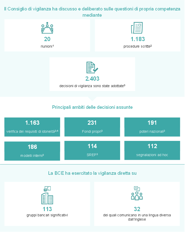 Si tratta di decisioni di vigilanza finalizzate o adottate nel periodo di segnalazione (ovvero decisioni emesse). Il numero delle decisioni di vigilanza non corrisponde al numero dei procedimenti autorizzativi comunicati ufficialmente alla BCE nel periodo di segnalazione (ovvero procedimenti di notifica in ingresso). Ciascuna decisione può contenere diverse autorizzazioni di vigilanza.