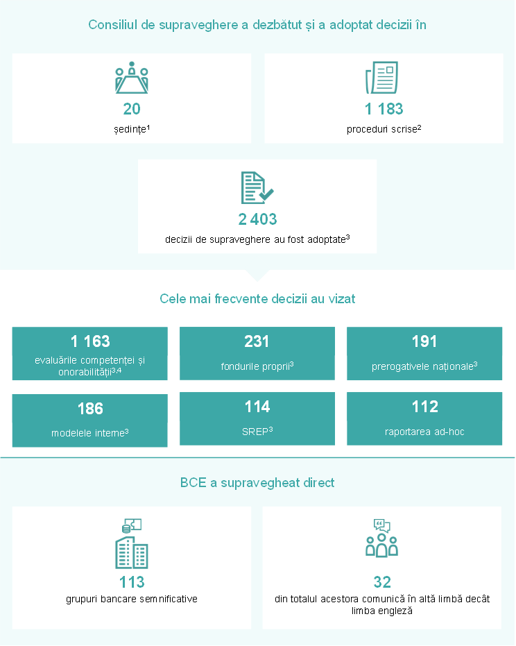 Aceste decizii se referă la decizii finalizate sau adoptate în perioada de raportare (mai exact, decizii transmise). Numărul de decizii de supraveghere nu corespunde numărului de proceduri de autorizare care au fost notificate BCE în mod oficial în perioada de raportare (mai exact, proceduri de notificare primite). O decizie poate conține mai multe aprobări de supraveghere.